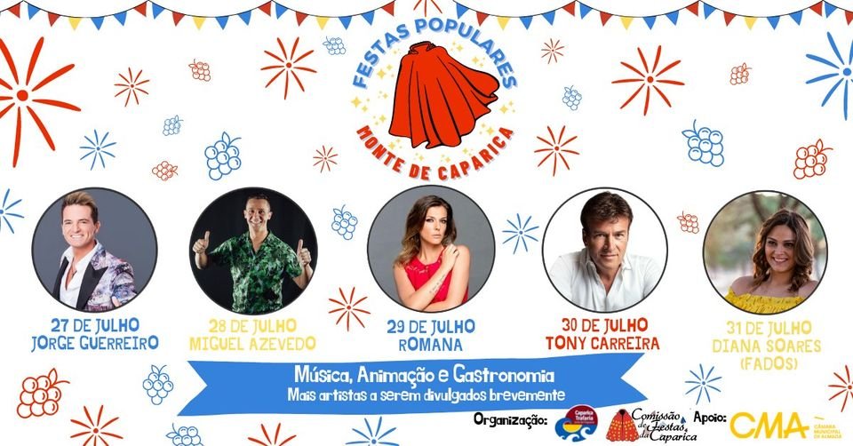 Conhece aqui o programa das Festas Populares: 27 de Julho 19:00 - Abertura dos stands de gastronomia e artesanato 21:00 - Arruada com fanfarra dos Bombeiros Voluntários da Trafaria 21:20 - Inauguração do Espaço de Atividades e Exposição "550º Aniversário da Freguesia da Caparica" 22:00 - Atuação com Jorge Guerreiro (Palco do Monte) 23:30 - 01:00 - Atuação com Dj Alex (Palco Sunset) 28 de Julho 19:00 - Abertura dos stands de gastronomia e artesanato 19:00 - Música Ambiente (Palco Sunset) 19:00 - Abertura do Espaço de Actividades (Espaço Junta, Exposição, Biblioteca, Jogos e Pinturas Faciais) 19:00 - 21:00 - Desporto com a Lifeshaker 20:00 - 20:30 - Atuação com Tuna Maria (Palco Sunset) 22:00 - Actuação com Miguel Azevedo (Palco do Monte) 23:30 - 01:00 - Atuação com Dj Alex (Palco Sunset) 29 de Julho 19:00 - Abertura dos stands de gastronomia e artesanato 19:00 - Música Ambiente (Palco sunset) 19:00 - Abertura do Espaço de Actividades (Espaço Junta, Exposição, Biblioteca, Jogos e Pinturas Faciais) 19:00 - 21:00 - Desporto com a Lifeshaker 20:00 - 21:00 - Arruada com Almada Street Band 21:00 - 22:00 - Atuação com Dj Alex (Palco Sunset) 22:00 - Atuação com Romana (Palco do Monte) 23:30 - 01:00 - Atuação com Dj Alex (Palco Sunset) 30 de Julho 16:00 - Abertura dos stands de gastronomia e artesanato 16:00 - Música Ambiente (Palco Sunset) 16:00 - Abertura do Espaço de Actividades (Espaço Junta, Exposição, Biblioteca, Jogos e Pinturas Faciais) 17:00 - 17:30 - Atuação com Antunia (Palco Sunset) 18:00 - 19:00 - Arruada seguida de concerto com Grupo de Concertinas com Associação Águias Vermelhas 19:00 - 21:00 - Desporto com a Lifeshaker 19:30 - 21:00 - Atuação com Tanya (Palco Sunset) 21:00 - Música ambiente (Palco Sunset) 22:00 - Atuação com Tony Carreira (Palco Monte) 23:30 - 01:00 - Atuação com Dj Alex (Palco Sunset) 31 de Julho 16:00 - Abertura dos stands de gastronomia e artesanato 16:00 - Música Ambiente (Palco Sunset) 16:00 - Abertura do Espaço de Actividades (Espaço Junta, Exposição, Biblioteca, Jogos e Pinturas Faciais) 17:00 - 18:00 - Atuação do Gripo de Cantares - Associação Águias Vermelhas (Palco Sunset) 18:00 - 19:00 - Música Ambiente (Palco Sunset) 19:00 - 21:00 - Desporto com a Lifeshaker 19:00 - Atuação de fado (Palco Sunset) - Conceição Ribeiro - Catarina Grilo - Rosa Borges - Bítor Miranda - Daniel Coleljo - Luís Carlos 21:00 - Arruada com Porbatuka 22:00 - Homenagens em palco e entrefa de prémios Exposição "550º Aniversário da Freguesia de Caparica" 22:30 - Atuação com Diana Soares (Palco Monte)