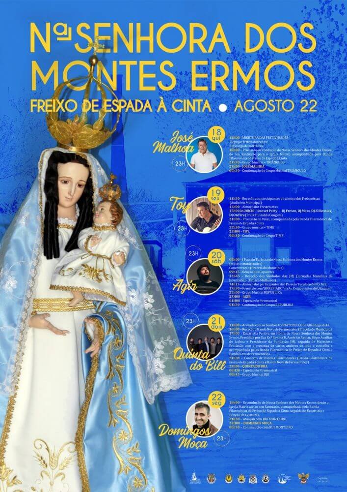 A Comissão de Festas em Honra de Nossa Senhora dos Montes Ermos em parceria com a Câmara Municipal de Freixo de Espada à Cinta, com o apoio das instituições do concelho, têm o prazer de anunciar o cartaz das festividades em Honra de Nossa Senhora dos Montes Ermos, que irão decorrer de 18 a 22 de agosto. Esta festividade apresenta-se, este ano, revitalizada e, sobretudo, com grande dinamismo, procurando transformar a icónica festa do verão na grande festividade caraterizadora do concelho de Freixo de Espada à Cinta, dirigida a diferentes públicos-alvo e capaz de atrair visitantes de todo o país. Tudo isto se reflete no investimento efetuado ao nível da animação musical e atividades paralelas que irão decorrer ao longo destes cinco dias, das quais se destacam, o almoço dos Freixenistas e as imponentes iniciativas de afirmação pública da fé que irão ter lugar, como a Eucaristia presidida por Sua Exª Rev.ma D. Américo Aguiar, Bispo Auxiliar de Lisboa e Presidente da Fundação das Jornadas Mundiais da Juventude, seguida de Majestosa Procissão onde estarão presentes os andores mais importantes das freguesias do nosso concelho. Esta é uma clara aposta da Comissão de Festas em Honra de Nossa Senhora dos Montes Ermos e da Câmara Municipal de Freixo de Espada à Cinta em dignificar e valorizar uma festividade tão importante para a identidade e história do concelho de Freixo de Espada à Cinta, acrescentando-lhe qualidade, visibilidade e todo o orgulho freixenista. Conhece aqui o programa da Festa de Nossa Senhora dos Montes Ermos: 18 de Agosto 12:00 - Abertura das Festividades 18:00 - Procissão de condução de Nossa Senhora dos Montes Ermos do seu santuário para a Igreja Matriz, acompanhada da Banda Filarmónica de Freixo de Espada à Cinta 21:30 - Grupo Musical - Triângulo 23:00 - José Malhoa 00:30 - Cotinuação do Grupo Musical Triângulo 19 de Agosto 11:30 - Recepção aos participantes do almoço dos freixenistas 13:00 - Almoço dos freixenistas 15:00 - Sunset Party - Dj Fresco, Dj Mass e Dj El Bessias, Dj On Fire (Praia Fluvial) 21:00 - Procissão de Velas acompanhada da Banda Filarmónica de Freixo de Espada à Cinta 22:30 - Grupo musical TIME 23:00 - Toy 00:30 - Continuação do Grupo TIME 20 de Agosto 09:00 - I Passeio Turistico de Nossa Senhora dos Montes Ermos - motas e motorizadas 09:45 - Bençao dos Capacetes 13:45 - Receção dos simbolos das JMJ (Jornadas Mundiais da Juventude) 14:15 - Almoço dos pariticpantes do Passeio Turistico 17:30 - Freestyle com ARREPIADO na Av. Combatentes do Ultramar 22:00 - Grupo Musical Repúblika 23:00 - Agir 01:00 - Espetáculo Piromusical 01:30 - Continuação do Grupo Repúblika 21 de Agosto 11:00 - Arruada com os bombos US BAR N'PELLE de alfândega da Fé 16:00 - Recepção à Banda Nova de Fermentelos 17:00 - Eucaristia Festiva em Honra de Nossa Senhora dos Montes Ermos seguida da Majestosa procissão 21:30 - Concerto de Bandas Filarmónicas (Banda Filarmónica de Freixo de Espada à Cinta e Banda Nova de Fermentelos) 23:00 - Quinta do Bill 00:30 - Espetáculo Piromusical 00:45 - Grupo Musical RJB 23:00 - Quinta do Bill 22 de Agosto 11:00 - Recondução de Nossa Senhora dos Montes Ermos desde Igreja Matriz até ao seu Santuário 21:30 - Atuação com Rui Monteiro 23:00 - Domingos Moça 00:30 - Continuação com Rui Monteiro