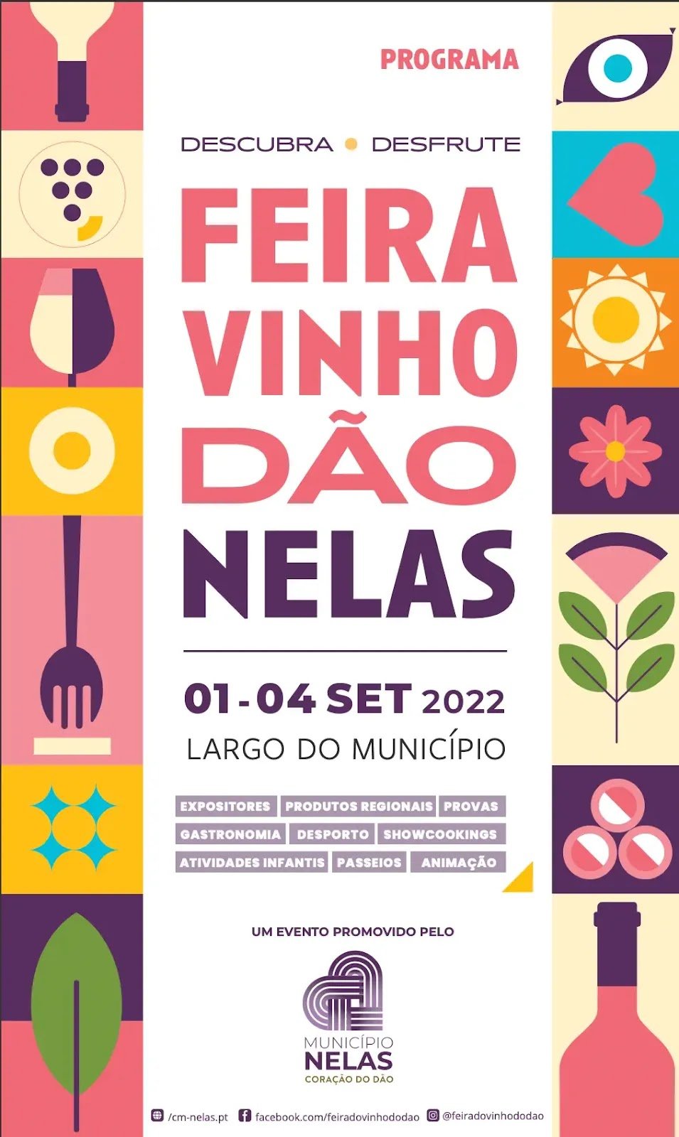 Conhece aqui o programa da Feira do Vinho do Dão: 03 e 04 setembro 18:00 - Provas "O MELHOR DO CONCURSO FEIRA DO VINHO DO DÃO" 2 de Setembro 16:15 - ARRUADA BOMBOS PAÇO, CANAS DE SENHORIM (Largo do Município) 16:30 - SESSÃO SOLENE DA 31ª FEIRA DO VINHO DO DÃO (Auditório do Edifício Multiusos) 17:00 às 19:30 - Atividades para crianças INSUFLÁVEIS E PINTURAS FACIAIS 21:00 às 23:00 - Atividades para crianças INSUFLÁVEIS E PINTURAS FACIAIS (Largo do Município, Espaço Criança) 18:00 - BACO E DIONÍSIO (Largo do Município e Praça de Alimentação) 18:00 - SABORES DA NOSSA TERRA (Largo do Município, Espaço Showcooking) 19:00 - abertura PRAÇA DE ALIMENTAÇÃO (Mercado Municipal) 20:00 - TEATRO DE RUA E ARTE CIRCENSE TEATRO HÁBITOS (Largo do Município) 22:00 - ANA BACALHAU (Largo do Município) 23:30 - After Hours: - COMPASS COLLECTIVE - GRYZZLER 3 de Setembro Durante o dia [sáb e dom] DÃO NELAS OPEN - Torneio Federado de Ténis 09h00 às 20:00 - VII ENCONTRO INTERNACIONAL DE FUTEBOL VETERANO 09:00 - À DESCOBERTA DO DÃO 10:30 - Atividades para crianças / Showcooking “CAKE POPS” (Largo do Município, Espaço Showcooking) 11:00 - TSF EM DIRETO “TERRA-A-TERRA” (Largo do Município) 12h00 Abertura - PRAÇA DE ALIMENTAÇÃO (Mercado Municipal 15:00 - INAUGURAÇÃO . PARQUE DE ESTACIONAMENTO DE AUTOCARAVANAS (Largo da Feira Mensal) 15:30 - “O GRANDE AAA-UUUH!” História cantada (Largo do Município, Espaço Criança) 16:00 - “CHAP, CHAP!” Espetáculo para bebés (Edifício Multiusos, Sala Orgânica, Piso 2) 16:30 - AS NOSSAS RAÍZES REINTERPRETADAS . O NOSSO TERRITÓRIO E PRODUTOS AUTÓCTONES (Largo do Município, Espaço Showcooking) 17:00 - Animação BACO E DIONÍSIO (Largo do Município) 17:30 - PÃO DE MASSA MÃE E DE FERMENTAÇÃO LENTA (Largo do Município, Espaço Showcooking) 17:30 - Promoção Territorial "DÃO EMOÇÕES" (Auditório do Edifício Multiusos) 18:00 - Provas "O MELHOR DO CONCURSO FEIRA DO VINHO DO DÃO . 10 BRANCOS, 5 ROSADOS" 18h30 às 19:30 - Animação ESPETÁCULO ITINERANTE ZÉ MÁGICO Magia, Espetáculo,Ilusionismo 21h00 às 22:00 - Animação ESPETÁCULO ITINERANTE ZÉ MÁGICO Magia, Espetáculo,Ilusionismo Largo do Município 18h30 às 19:30 - Atividades para crianças INSUFLÁVEIS E PINTURAS FACIAIS 21h00 às 23:00 - Atividades para crianças INSUFLÁVEIS E PINTURAS FACIAIS 18:30 - COMO SE PRODUZ E FAZ O QUEIJO SERRA DA ESTRELA (Largo do Município, Espaço Showcooking) 18:30 - TARDE FOLCLÓRICA - Grupo de Danças e Cantares Regionais “Os Santarenses” - Rancho Folclórico “Rosas do Mondego” de Vale de Madeiros - Rancho Folclórico de Vilar Seco 22:00 - GISELA JOÃO (Largo do Município) 23:30 - After Hours: WILSON HONRADO GRYZZLER 4 de Setembro 09h00 às 13:00 - VII ENCONTRO INTERNACIONAL DE FUTEBOL VETERANO 09:00 - XI MEIA MARATONA BTT DÃO NELAS 09:00 - “VISEU DÃO LAFÕES PÉ ANTE PÉ” 10:00 - O MEL com a Associação dos Apicultores da Beira Alta (Largo do Município, Tenda Showcooking) 10:30 - Atividades para crianças “CORAÇÃO DO DÃO” (Largo do Município, Espaço Criança) 11:00 - À DESCOBERTA DOS DIFERENTES TERROIRS DO DÃO EM HARMONIZAÇÃO COM ENCHIDOS (Largo do Município, Tenda Showcooking) 12:00 - Abertura da PRAÇA DE ALIMENTAÇÃO (Mercado Municipal) 12:30 - ENCONTRO DE MOTORIZADAS CLÁSSICAS (Largo do Município) 15:00 - Encontros: - MINIS ENTRE AS VINHAS DO DÃO - PASSEIO DE AUTOMÓVEIS ANTIGOS . CORAÇÃO DO DÃO - MK-KLASSICOS, PASSEIO DE AUTOMÓVEIS ANTIGOS Concentração no Largo do Município 15:00 - Atividades para crianças “CHAPÉUS COM HISTÓRIA!” (Largo do Município, Espaço Criança) 15h30 Atividades para crianças / Showcooking “OFICINA DO ÓSCAR: OOPSIES E ÓSCARITOS!” (Largo do Município, Espaço Showcooking) 16:00 - ARRUADA BOMBOS CIMO DO POVO, NELAS (Largo do Município) 16:00 - ESPETÁCULO ITINERANTE ZÉ MÁGICO (Largo do Município) 19:30 - ESPETÁCULO ITINERANTE ZÉ MÁGICO (Largo do Município) 16:30 - ESCANÇÃO VS “PROVADOR DE VINHOS” (Largo do Município) 17:00 - “CRAFT, TURISMO CRIATIVO” Apresentação do Projeto (Auditório do Edifício Multiusos) 17:00 - PROVA DE AZEITE (Largo do Município, Tenda Showcooking) 18:00 - Provas "O MELHOR DO CONCURSO FEIRA DO VINHO DO DÃO 5 ROSADOS, 10 TINTOS" 18:00 - PICA PAU DE COGUMELOS E PATANISCAS DE ENCHIDOS E QUEIJO DA SERRA (Largo do Município, Tenda Showcooking) 18:30 - Atividades para crianças INSUFLÁVEIS E PINTURAS FACIAIS 21:00 - Atividades para crianças INSUFLÁVEIS E PINTURAS FACIAIS Largo do Município, Espaço Criança 19:00 - “SUNSET, WINE & DÃO” com Gryzzler e Pira (Largo do Município) 20:30 - TEATRO DE RUA E ARTE CIRCENSE TEATRO HÁBITOS (Largo do Município) 22:00 - Concerto com MARA PEDRO (Largo do Município)
