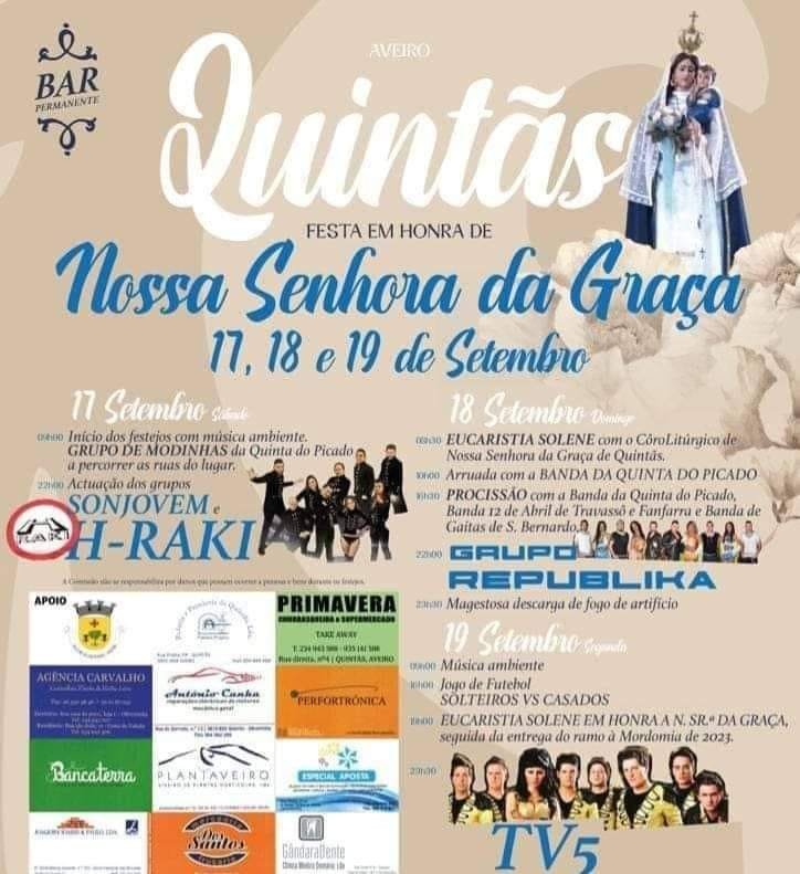 Ecrã completoEvento terminadoFesta de Quintãs 2022📅Datasábado, 17 de setembro de 2022(3 dias)até segunda-feira, 19 de setembro de 2022📍LocalQuintãs, Oliveirinha, Aveiro (Aveiro)🗺️DireçõesWaze|Google MapsSobre este eventoFesta de Quintãs 2022Localização