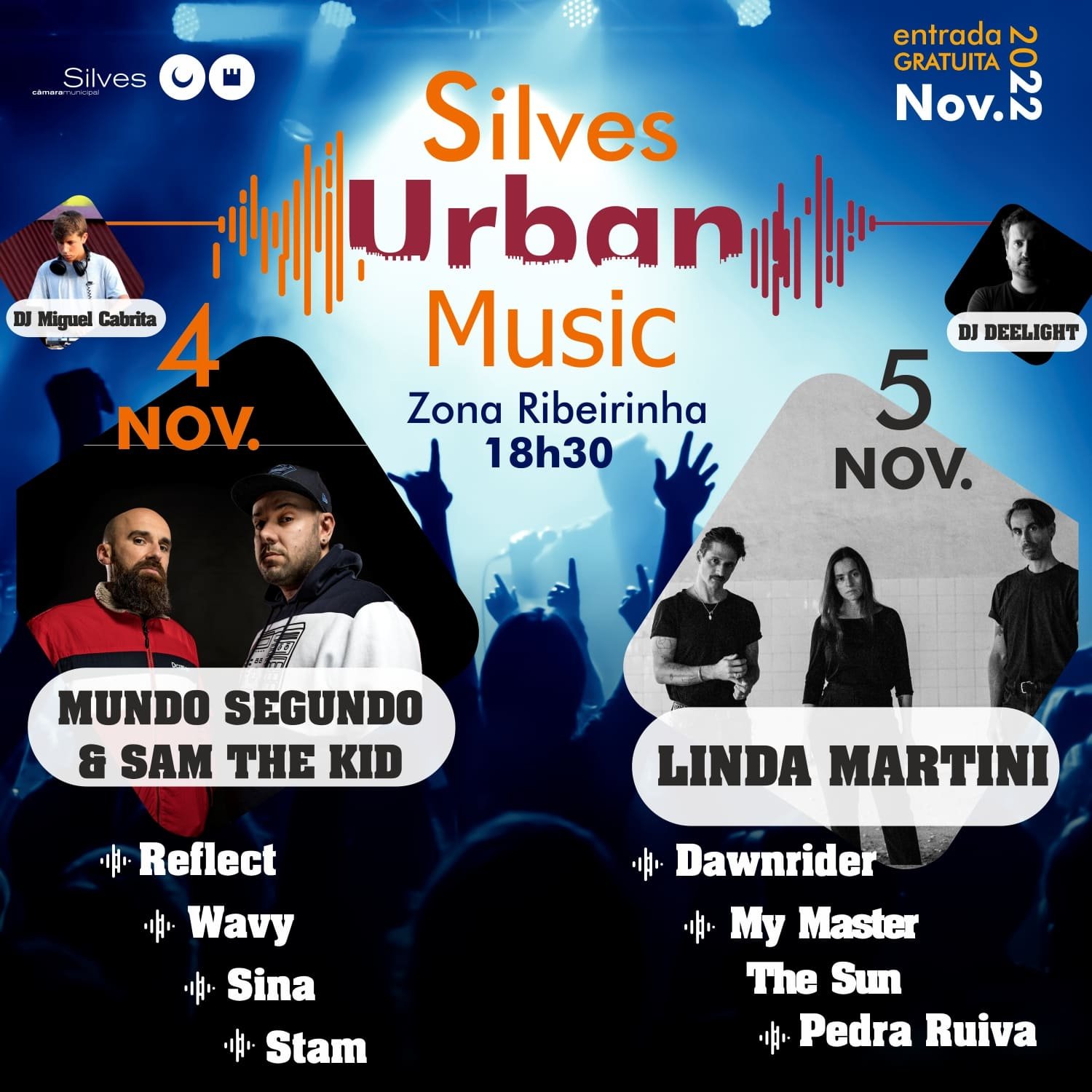 Programa da Silves Urban Music: 4 de Novembro Mundo Segundo e Sam The Kid Reflext Wavy Sina Stam Dj Miguel Cabrita 5 de Novembro Linda Martini Dawnrider My master the Sun Pedra Ruiva Dj Deelight