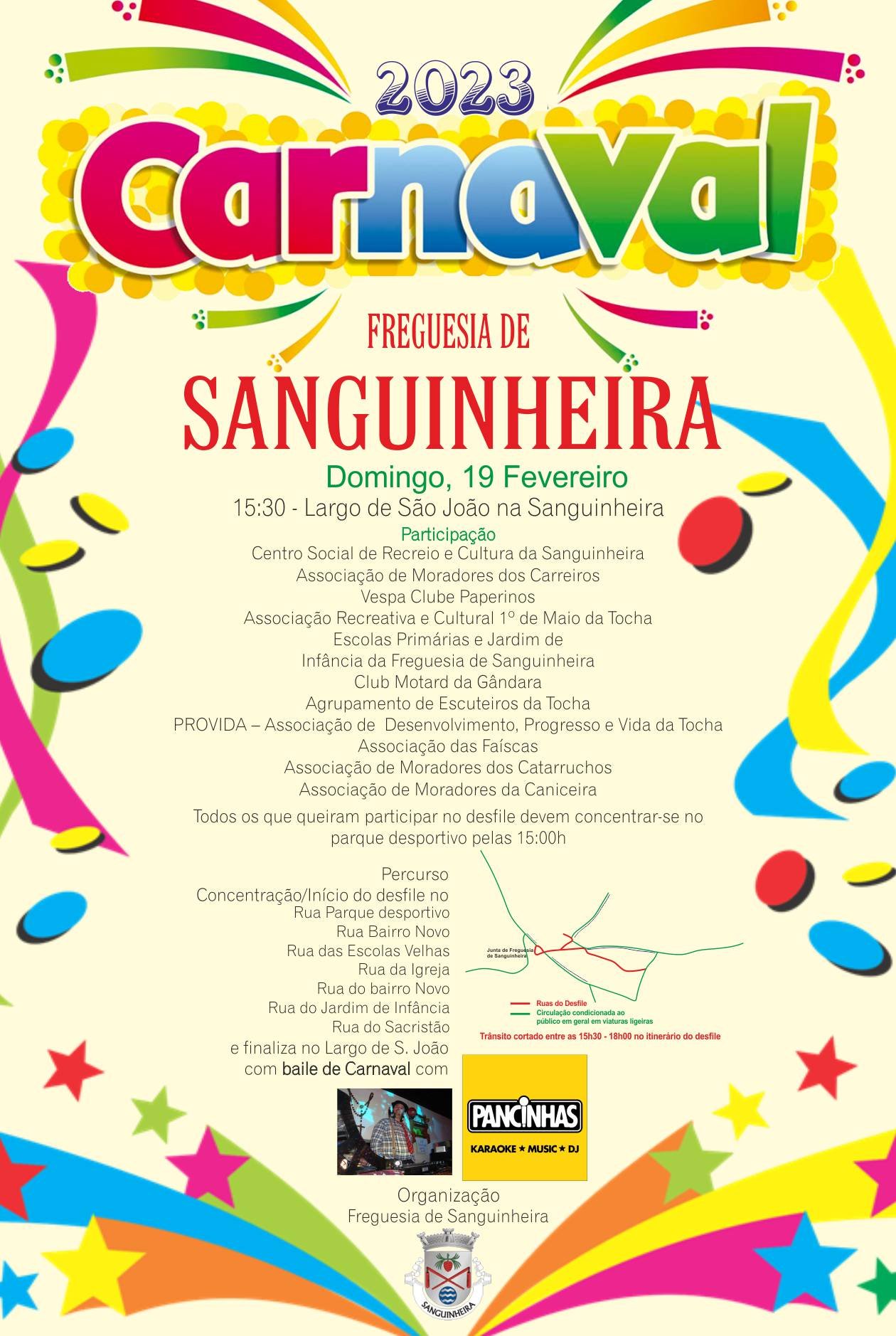 Programa do Carnaval de Sanguinheira: 19 de Fevereiro 15:30 - Desfile de Carnaval - O desfile é seguido de baile de carnaval Percurso do Carnaval de Sanguinheira Rua Parque Desportio Rua Bairro Novo Rua das Escolas Velhas Rua da Igreja Rua do Bairro Novo Rua do Jardim de Infância Rua do Sacristão Largo de São João