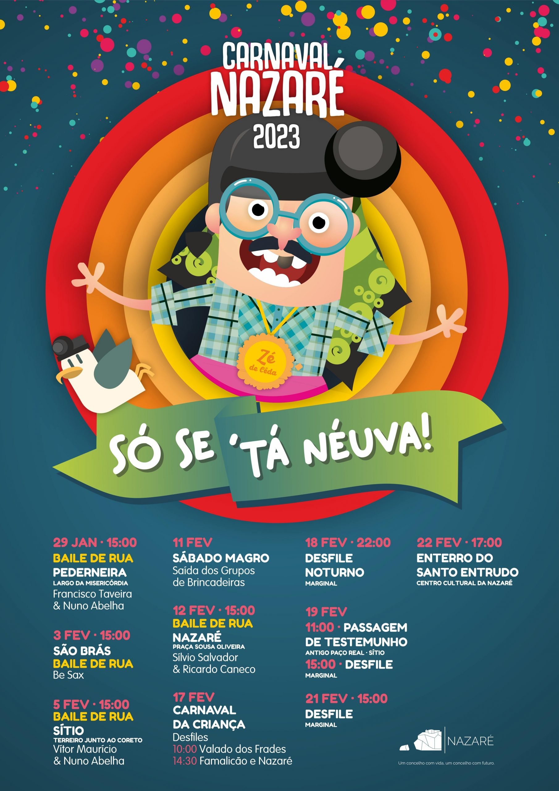 Sábado, 21.01.23, 15h00 Apresentação dos Reis e inauguração da Exposição Cegada “A gente cá s´intende”, com o Domingos Quico, Abílio Júlio e Álvaro Guincho Danças, Canções, Marchas, Grupo de Ana Maria Mendes e a Rábula: “A Fruta”, com Pompeu Tomé e Luís Carlos Sábado, 4.02.23, 15h00 Baile com Nuno Abelha, Vitor Mauricio e Tiago Batalha BAILES DE RUA Pederneira - Largo da Misericórdia: 29 de janeiro, 15h00, Francisco Taveira e Nuno Abelha São Brás: 3 de fevereiro, 15h00, Be Sax Sítio – Coreto, junto ao Santuário Nossa Senhora da Nazaré: 5 de fevereiro, 15h00, Vitor Maurício e Nuno Abelha Praia - Praça Sousa Oliveira: 12 fevereiro, 15h00, Sílvio Salvador e Ricardo Caneco DESFILES 11 fevereiro - Sábado Magro 17 fevereiro - Desfile das Escolas (10h00 Valado dos Frades; 14h30 Famalicão e Nazaré) 18 fevereiro - Desfile noturno 19 fevereiro - Desfile de domingo 21 fevereiro - Desfile de terça-feira 22 fevereiro - Quarta-feira de Cinzas - Enterro do Santo Entrudo