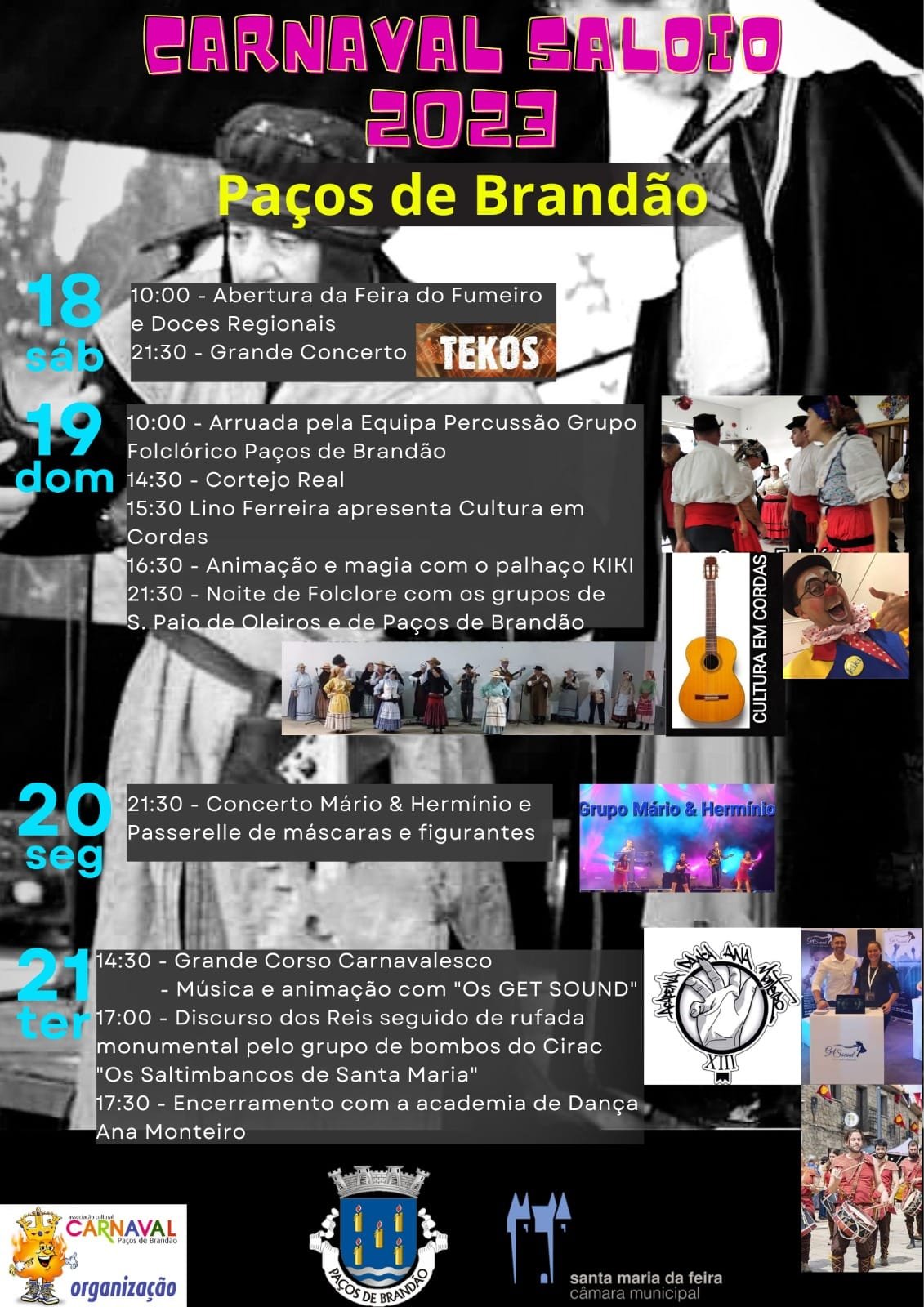 Programa do Carnaval de Paços de Brandão: 18 de Fevereiro 10:00 - Abertura da Feira do Fumeiro e Doces regionais 21:30 - Grande Concerto Tekos 19 de Fevereiro 10:00 - Arruada pela Equipa Percussão Grupo Folclórico Paços de Brandão 14:30 - Cortejo Real 15:30 - Lino Ferreira apresenta Cultura em Cordas 16:30 - Animação e magia com o palhaço Kiki 21:30 - Noite de Folclore co mos grupos de São Paio de oleiros e Paços de Brandão 20 de Fevereiro 21:30 - Concerto Mário e Herminio e passerelle de máscaras e figurantes 21 de Fevereiro 14:30 - Grande Corso Carnavalesco - Música e animação com os "Get Sound" 17:00 - Discurso dos reis seguido de rufada monumental pelo grupo de bombos do Crac "os Saltibancos de Santa Maria" 17:30 - Encerramento com a academia de Dança Ana Monteiro