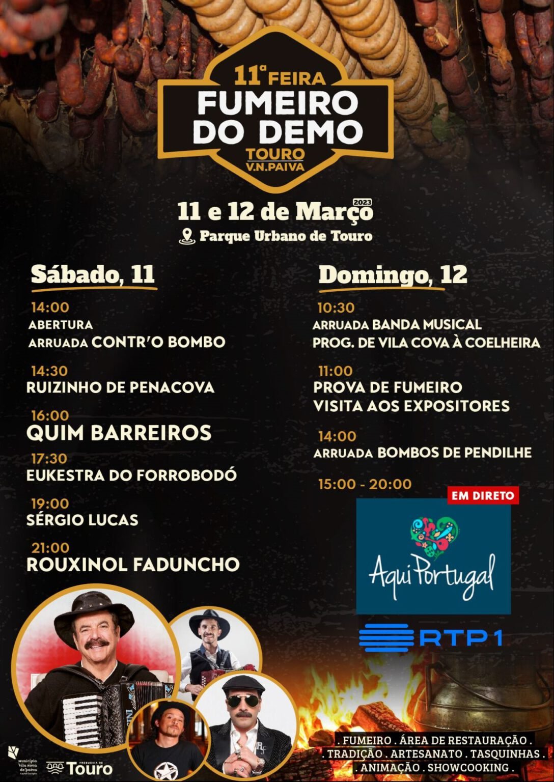 O Parque Urbano da freguesia de Touro recebe uma vez mais este certame, promovido pelo Município de Vila Nova de Paiva, em parceria com a Junta de Freguesia de Touro. Com o seu âmbito alargado para dois dias, a 11ª edição da Feira do Fumeiro do Demo conta com a transmissão em direto do programa Aqui Portugal da RTP1 e a atuação de vários artistas convidados, durante a tarde do dia 12, domingo. A animação será uma constante no certame que abre, no sábado, com as atuações do Grupo Contr’o Bombo, seguindo-se Ruizinho de Penacova, Quim Barreiros, Eukestra do Forrobodó, Sérgio Lucas acompanhado ao piano por Paulo Lima e Rouxinol Faduncho a encerrar o programa do dia.