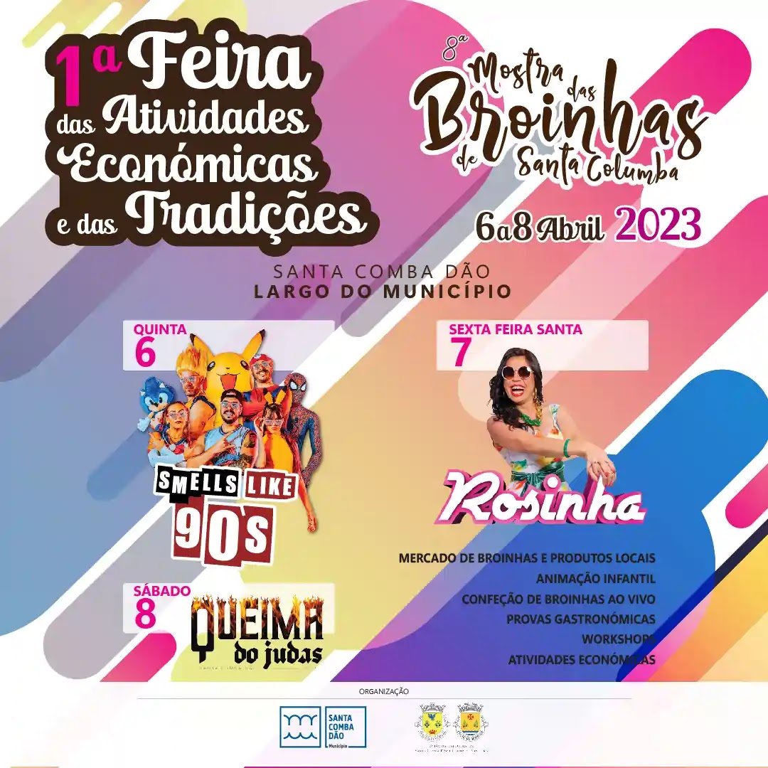 Programa da Festa de Atividades Económicas e Tradições: 6 de Abril - Smells Like 90's 7 de Abril - Rosinha 8 de Abril - Queima do Judas