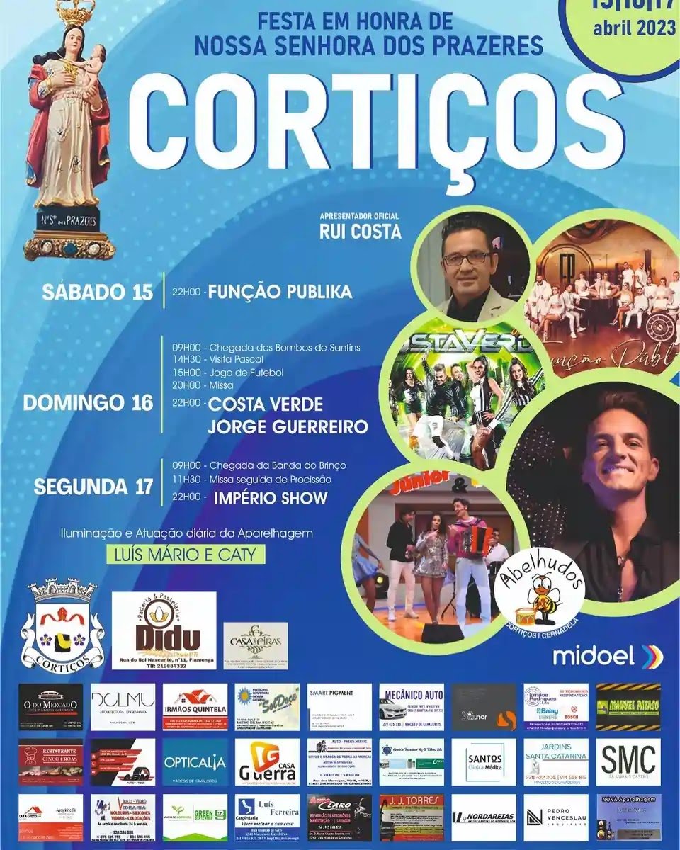 Programa da Festa de Nossa Senhora dos Prazeres 2023: 15 de Abril 22:00 - Função Publika 16 de Abril 09:00 - Chegada dos Bombos de Sanfins 14:30 - Visita Pascal 15:00 - Jogo de Futebol 20:00 - Missa 22:00 - Costa Verde - Jorge Guerreiro 17 de Abril 09:00 - Chegada da Banda do Brinço 11:30 - Missa seguida de procissão 22:00 - Império Show