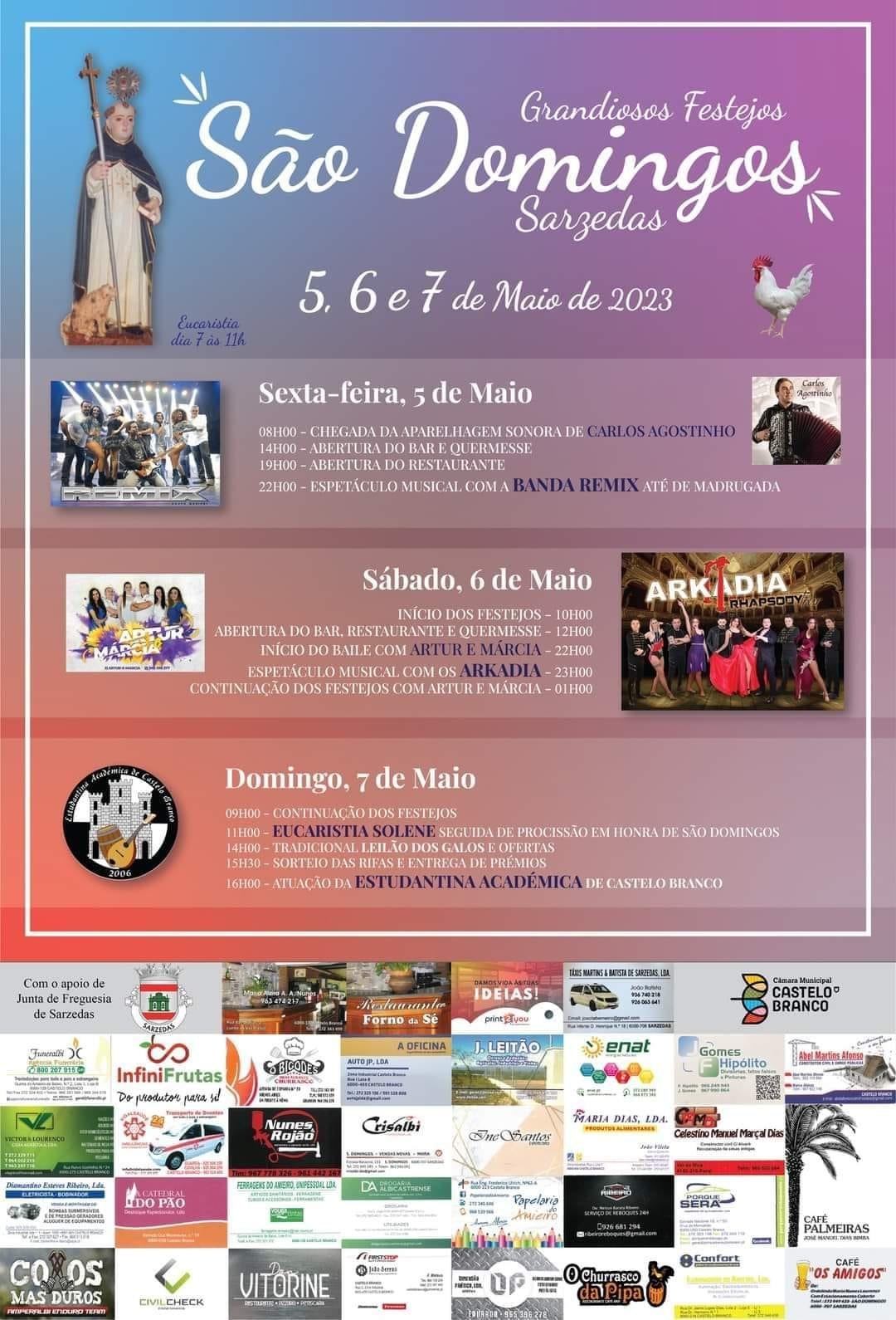 Grandiosos Festejos São Domingos 5, 6 e 7 de Maio de 2023 Eucaristia dia 7 às 11h Sexta-feira, 5 de Maio 08H00 - CHEGADA DA APARELHAGEM SONORA DE CARLOS AGOSTINHO 14H00 - ABERTURA DO BAR E QUERMESSE 19H00 - ABERTURA DO RESTAURANTE 22H00 - ESPETÁCULO MUSICAL COM A BANDA REMIX ATÉ DE MADRUGADA Sábado, 6 de Maio 10H00 - INÍCIO DOS FESTEJOS 12H00 - ABERTURA DO BAR, RESTAURANTE E QUERMESSE 22H00 - INÍCIO DO BAILE COM ARTUR E MÁRCIA 23H00 - ESPETÁCULO MUSICAL COM OS ARKADIA 01H00 - CONTINUAÇÃO DOS FESTEJOS COM ARTUR E MÁRCIA Domingo, 7 de Maio 09H00 - CONTINUAÇÃO DOS FESTEJOS 11H00 - EUCARISTIA SOLENE SEGUIDA DE PROCISSÃO EM HONRA DE SÃO DOMINGOS 14H00 - TRADICIONAL LEILÃO DOS GALOS E OFERTAS 15H30 - SORTEIO DAS RIFAS E ENTREGA DE PRÉMIOS 16H00 - ATUAÇÃO DA ESTUDANTINA ACADÉMICA DE CASTELO BRANCO
