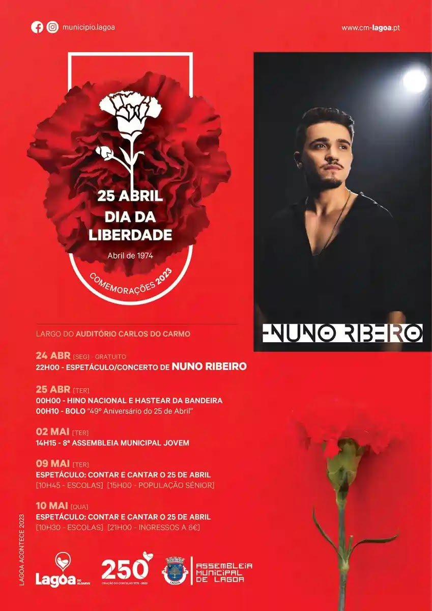 Dia 25 de Abril assinala o 49º aniversário da Revolução dos Cravos e o Município de Lagoa irá celebrar este dia com um conjunto de atividades que se prolongam até dia 02 de maio. No dia 24 de abril, pelas 22h00 realiza-se o concerto de “Nuno Ribeiro”, no Largo do Auditório Carlos do Carmo, que promete uma noite ao som das músicas do cantor onde não irão faltar os maiores êxitos. No dia 25 de Abril, logo pela meia-noite, haverá o Hastear da Bandeira ao som do Hino Nacional. Pelas 00h10 será servido o Bolo do 49º Aniversário do 25 de Abril. No dia 02 de maio as celebrações prosseguem com a realização da 8ª Assembleia Municipal Jovem pelas 14h15, no Auditório Carlos do Carmo. Dia 09 e 10 de abril o Auditório Carlos do Carmo recebe o espetáculo "Contar e Cantar o 25 de Abril" com apresentações à comunidade escolar e comunidade sénior de Lagoa. As celebrações de Abril encerram no dia 10 de maio com o espetáculo "Contar e Cantar o 25 de Abril" a realizar no Auditório Carlos do Carmo, pelas 21h00. Este espetáculo tem um custo de €6 e os bilhetes estarão à venda, em breve, nos locais habituais.
