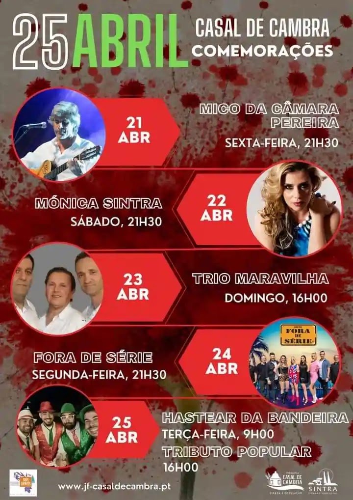 Programa das comemorações do 25 de Abril em Casal de Cambra 21 de Abril 21:30 - Mico da Câmara Pereira 22 de Abril 21:30 - Mónica Sinta 23 de Abril 16:00 - Trio Maravilha 24 de Abril 21:30 - Fora de Série 25 de Abril 9:00 - Hastear da Bandeira 16:00 - Tributo Popular