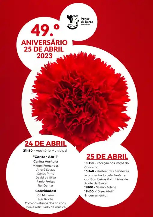 Ponte da Barca vai celebrar o 25 de abril de 1974 com várias atividades, que arrancam já no dia 24 de abril, segunda-feira, com o concerto Cantar Abril, onde atuarão vários artistas e convidados, às 21h30, no Auditório Municipal. No dia 25 de abril, terça-feira, a partir das 10h30, nos Paços do Concelho, decorrerá a habitual Sessão Solene da Assembleia Municipal evocativa do 49.º Aniversário do 25 de Abril de 1974. A cerimónia terá início com o Hastear das Bandeiras, acompanhado pela Fanfarra dos Bombeiros Voluntários de Ponte da Barca, em honra do dia em que foi instaurada a liberdade em Portugal. A sessão solene contará com a presença autoridades locais, bem como de representantes das forças vivas do concelho. Durante a sessão solene, serão proferidos discursos alusivos à data, e outros momentos comemorativos da efeméride. A cerimónia evocativa do 49.º Aniversário do 25 de Abril de 1974 é uma oportunidade para relembrar e celebrar a importância da Revolução dos Cravos na história do país, bem como para refletir sobre os valores da democracia e da liberdade que devem continuar a ser defendidos e promovidos no presente e no futuro.