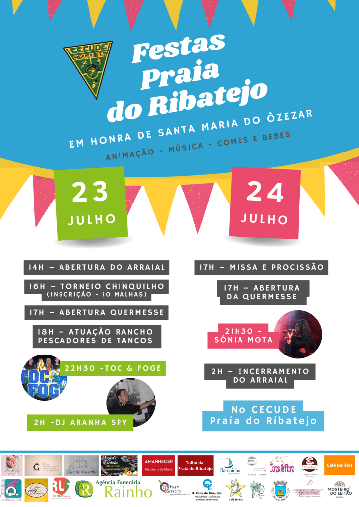 A freguesia de Praia do Ribatejo, no concelho de Vila Nova da Barquinha, vai estar em festa durante sábado e domingo, dia 23 e 24 de julho, com os festejos a realizarem-se no Centro Cultural e Desportivo de Praia do Ribatejo (CECUDE), onde não se realizavam desde 2013. Os festejos, em honra de Santa Maria do Ôzezar, contam com a animação da banda tramagalense Toc & Fog e do DJ Aranha Spy no sábado, enquanto Sónia Mota é a responsável por ajudar os presentes a fazer a festa no domingo. Com a abertura do arraial apontada para as 14h00, o dia de sábado conta também com a realização de um torneio de chinquilho às 16h00 (a inscrição são 10 ‘malhas’) e com a atuação do Grupo Folclórico “Os Pescadores de Tancos”, agendada para as 18h00. Já no dia 24, domingo, vai ser realizada missa e procissão, seguida da venda de fogaças. Os festejos, além de muita animação, contam ainda com comida (frango, febras, entremeadas, sardinhas, moelas, caracóis, sopa da pedra, entre outros petiscos), bebida, jogos e a tradicional quermesse.