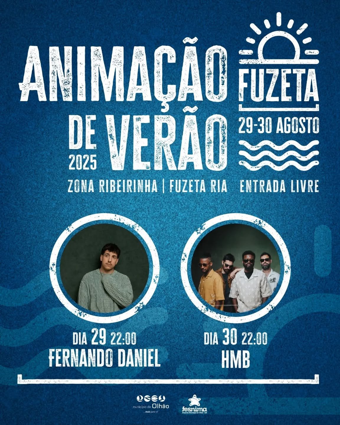 Animação de Verão 2025 - Fuzeta A Fuseta vai estar em festa. Nos dias 29 e 30 de agosto, a Zona Ribeirinha recebe dois concertos imperdíveis com entrada livre: - Fernando Daniel, dia 29 às 22:00 - HMB, dia 30 às 22:00 Dois dias de música, animação e boas vibrações junto à Ria.