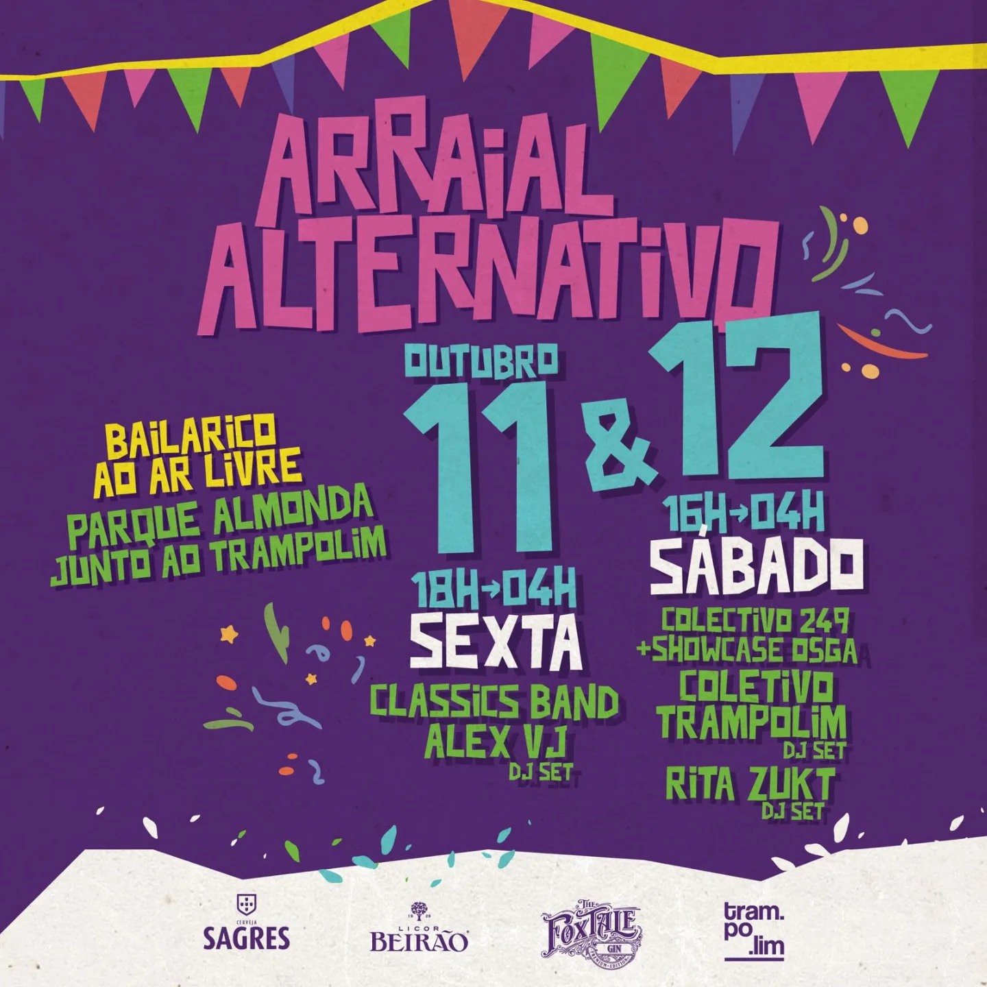 Arraial Alternativo 2024 - Torres Novas Há sempre tempo para mais um Arraial, não achas? ? Então marca o dia 11 e 12 de outubro na agenda! O verão até pode ter acabado, mas ninguém é capaz de dizer que não a mais um bailarico! ? Dia 11 e 12 levamos a festa até ao Parque Almonda, onde vais ter muita música e animação à tua espera! Vão ser dois dias especiais, rodeados de amigos. Tudo isto fora de portas, no jardim que temos ao lado do Trampolim, com o apoio da @cervejasagres, do @licor_beirao e da @foxtale.gin! ? Contamos contigo! ?