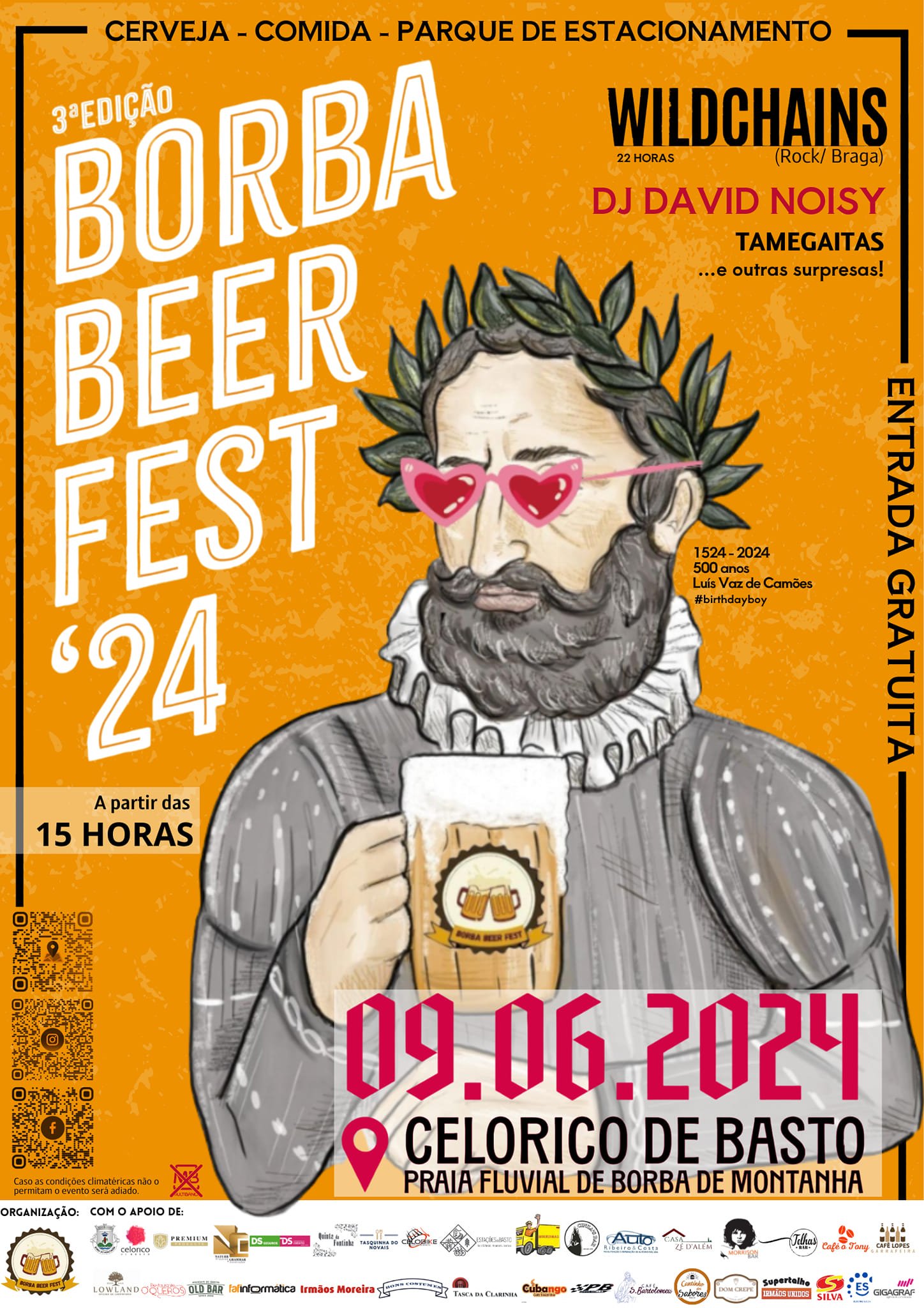 Borba Beer Fest 2024 - Celorico de Basto Está de regresso mais uma edição do Borba Beer Fest! Este ano o nosso Camões festeja 500 anos do seu nascimento e decidiu organizar a sua festa de aniversário na Praia Fluvial de Borba de Montanha. Dia 9 de Junho, o mote será o de sempre: uma experiência incrível com as melhores cervejas artesanais do mundo, juntando muita animação, surpresas e bons petiscos! O evento tem início marcado para as 15h e prolonga-se até às 4h da manhã, de dia 10. A entrada é gratuita e todos são bem-vindos. Contamos contigo, e com os teus, para brindarmos juntos nesta 3.ª edição, que promete ser inesquecível! Um brinde ao Camões! Bora? ?