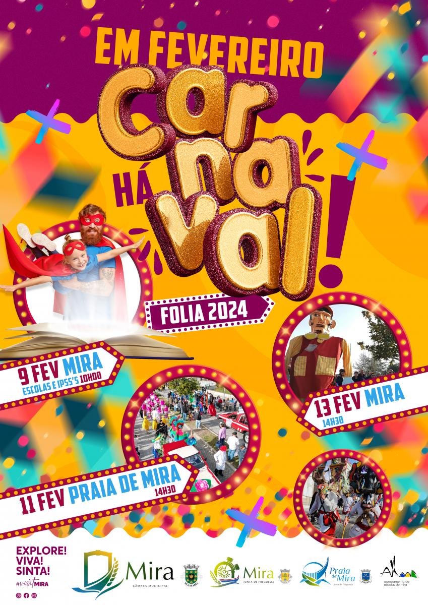 Carnaval 2024 - Mira 9 FEV - Mira 10H00 Escolas e IPSS's 11 FEV - Praia de Mira 14H30 13 FEV - Mira 14H30
