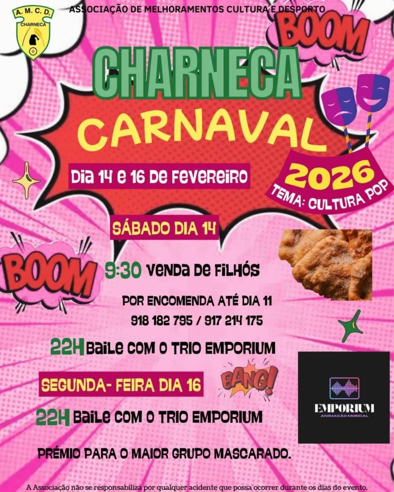 Tema: Cultura Pop. Venda de filhós, baile com o Trio Emporium, prémio para o maior grupo mascarado.