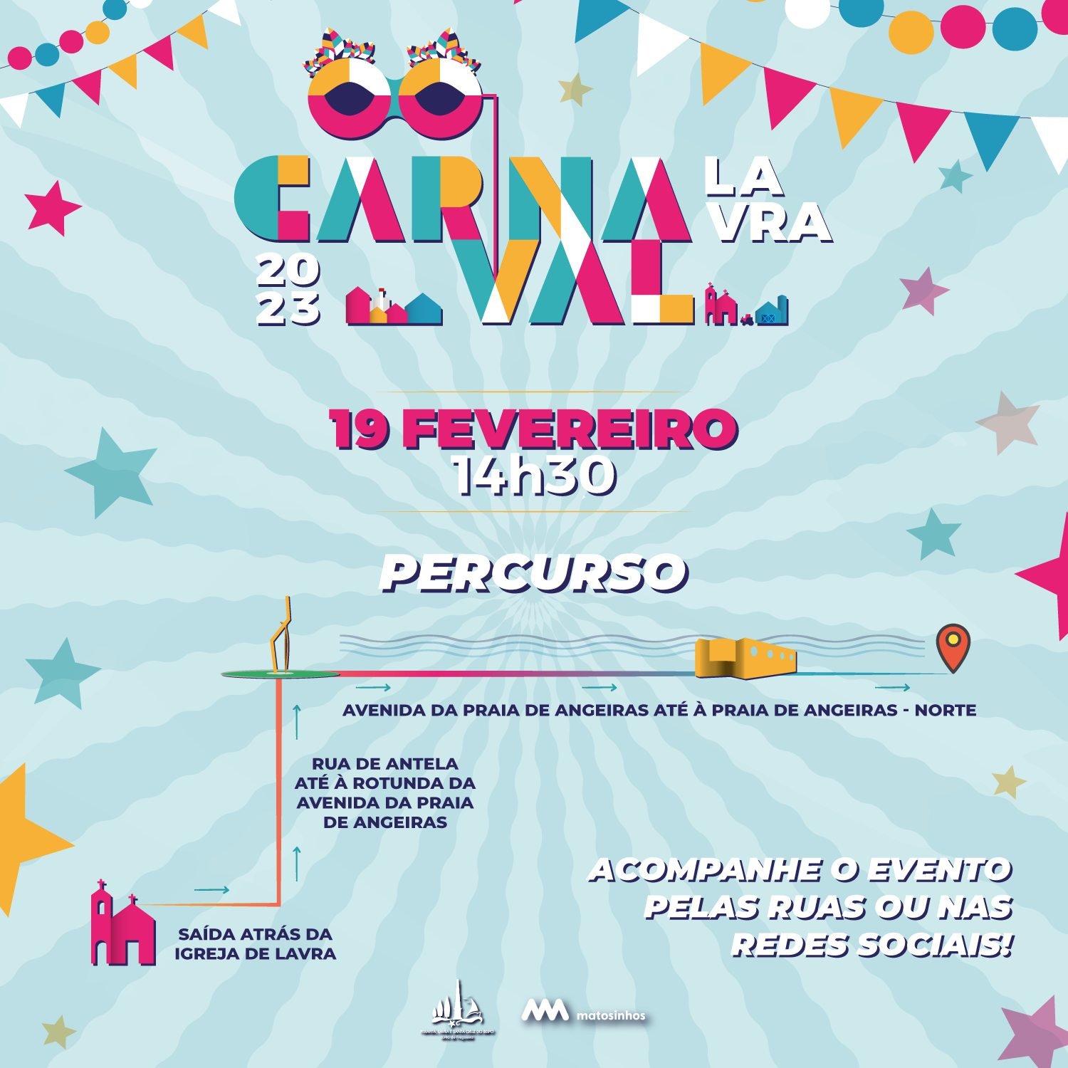 Programa do Carnaval de Lavra: 19 de Fevereiro 14:30 - Carnaval da Lavra Percurso do Carnaval de Lavra Igreja da Lavra Rua de Antela Rotunda da Avenida da Praia de Angeiras Avenida da Praia de Angeiras Praia das Angeiras