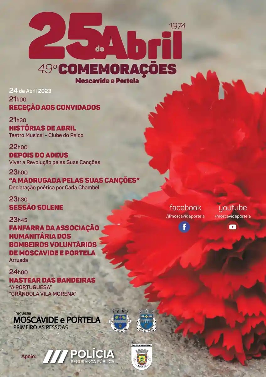 Programa das comemorações do 25 de Abril em Moscavide e Portela 24 DE ABRIL DE 2023 21h00 – RECEÇÃO AOS CONVIDADOS 21h30 – HISTÓRIAS DE ABRIL Teatro Musical: Clube do Palco 22h00 – DEPOIS DOS ADEUS Viver a revolução pelas suas canções 23h00 – A MADRUGADA PELAS SUAS CANÇÕES Declaração poética por Carla Chambel 23h30 – SESSÃO SOLENE Intervenções Institucionais 23h45 – ARRUADA DA FANFARRA DOS BOMBEIROS VOLUNTÁRIOS DE MOSCAVIDE E PORTELA 24h00 - HASTEAR DAS BANDEIRAS Hino de Portugal Grândola Vila Morena