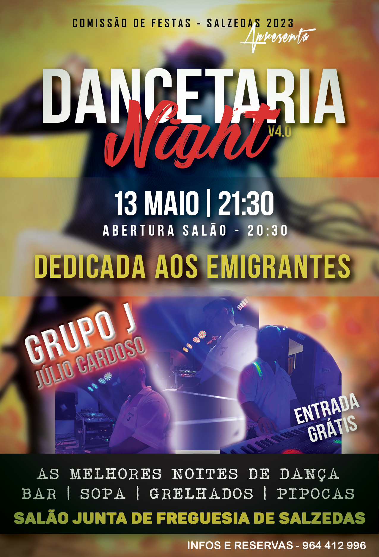 dancetaria night - v4.0 especial emigrantes e estamos de volta! Mais uma semana, mais um evento... 13 de maio 21:30 (abertura as 20:30) salao da junta de freguesia de salzedas mais uma noite de alegria, diversao e convivio! A animacao, como sempre, fica a nossa cargo! Esta noite vai ser dedicada aos emigrantes! Porque nas ferias, sabe sempre bem um pe de danca (se nao for para dancar, que seja para um copo com os amigos) ! Por isso nao faltes! Ja sabem: bar, grelhados, sopa e pipocas... Muitas pipocas! Reservas de mesa disponivel - 964 412 996 a musica fica a cargo do amigo julio cardoso, que todos conhecem pela sua energia para nos fazer abanar o esqueleto... Obrigado julio! Vai ser tooooopppppp... Ate jaaaaaaaa...