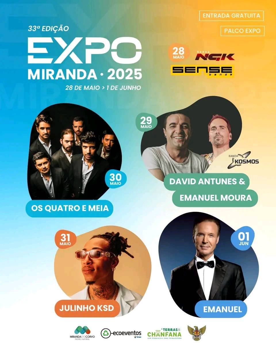 Expo Miranda 2025 - Miranda do Corvo Programa: 28 maio – NGK | Sense 29 maio – Kosmos | David Antunes & Emanuel Moura 30 maio – Mountain Valley | Os Quatro e Meia 31 maio – Julinho KSD 1 junho - Emanuel