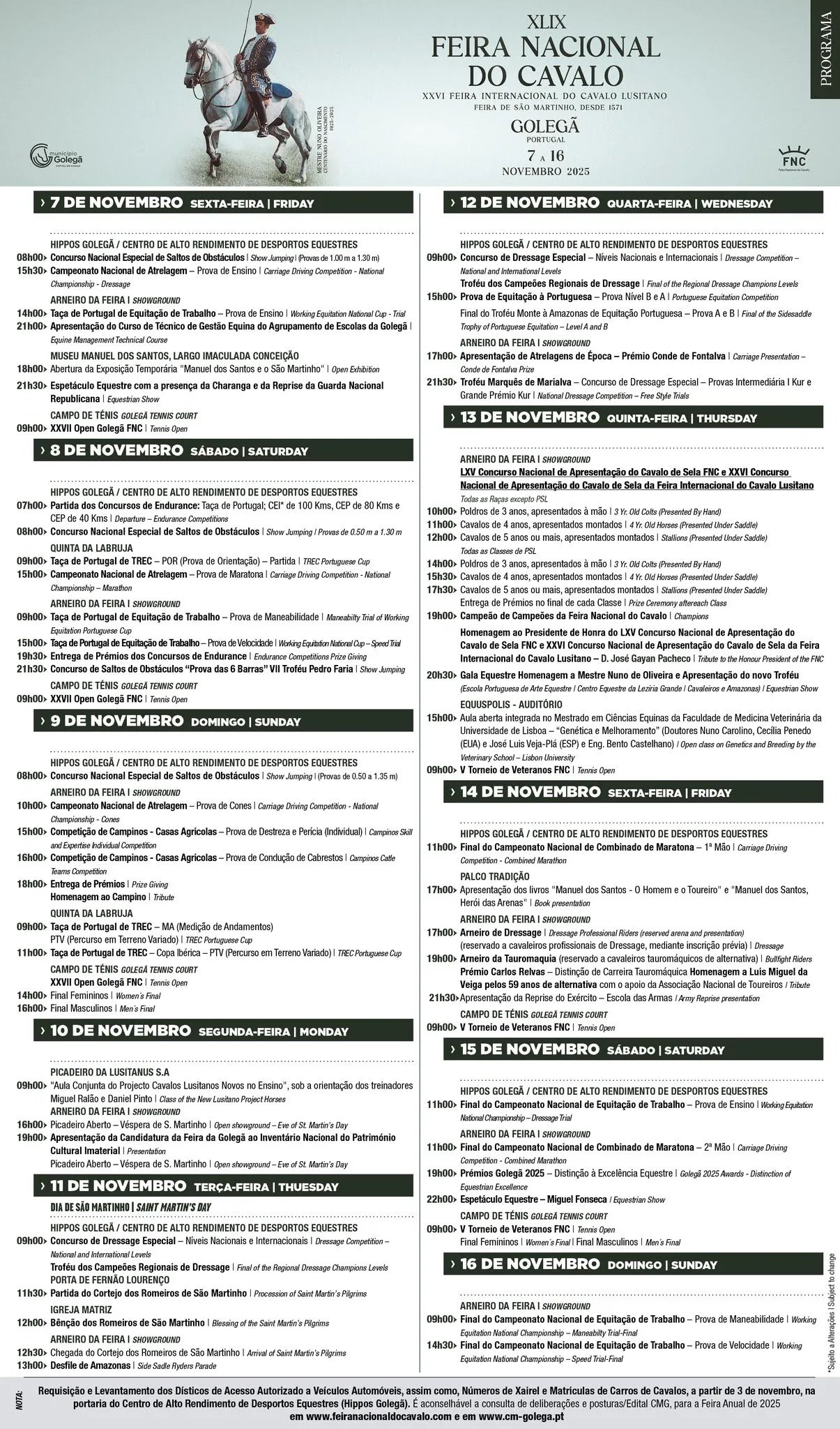 Feira Nacional do Cavalo 2025 - Golegã Programa: Aqui poderá ver o Programa da Feira da Golegã, por ordem de acontecimentos. 07 de Novembro (Sexta-Feira) 08:00 Concurso Nacional Especial de Saltos de Obstáculos – Provas de 1.00m a 1.30m (Hippos Golegã – Centro de Alto Rendimento de Desportos Equestres) 09:00 XXVII Open Golegã FNC – Tennis Open (Campo de Ténis) 14:00 Taça de Portugal de Equitação de Trabalho – Prova de Ensino (Largo do Arneiro) 15:30 Campeonato Nacional de Atrelagem – Prova de Ensino (Hippos Golegã – Centro de Alto Rendimento de Desportos Equestres) 18:00 Abertura da Exposição Temporária “Manuel dos Santos e o São Martinho” (Museu Manuel dos Santos – Largo Imaculada Conceição) 21:00 Apresentação do Curso de Técnico de Gestão Equina do Agrupamento de Escolas da Golegã (Largo do Arneiro) 21:30 Espetáculo Equestre com Charanga e Reprise da Guarda Nacional Republicana (Largo do Arneiro) 08 de Novembro (Sábado) 07:00 Partida dos Concursos de Endurance: Taça de Portugal; CEI* 100 km; CEP 80 km; CEP 40 km (Hippos Golegã – Centro de Alto Rendimento de Desportos Equestres) 08:00 Concurso Nacional Especial de Saltos de Obstáculos – Provas de 0.50m a 1.30m (Hippos Golegã – Centro de Alto Rendimento de Desportos Equestres) 09:00 XXVII Open Golegã FNC – Tennis Open (Campo de Ténis) 09:00 Taça de Portugal de Equitação de Trabalho – Prova de Maneabilidade (Largo do Arneiro) 09:00 Taça de Portugal de TREC – POR Prova de Orientação – Partida (Quinta da Labruja) 15:00 Taça de Portugal de Equitação de Trabalho – Prova de Velocidade (Largo do Arneiro) 15:00 Campeonato Nacional de Atrelagem – Prova de Maratona (Quinta da Labruja) 19:30 Entrega de Prémios dos Concursos de Endurance (Largo do Arneiro) 21:30 Concurso de Saltos de Obstáculos “Prova das 6 Barras” – VII Troféu Pedro Faria (Largo do Arneiro) 09 de Novembro (Domingo) 08:00 Concurso Nacional Especial de Saltos de Obstáculos – Provas de 0.50 e 1.35m (Hippos Golegã – Centro de Alto Rendimento de Desportos Equestres) 09:00 Taça de Portugal de TREC – MA Medição de Andamentos (Quinta da Labruja) 10:00 Campeonato Nacional de Atrelagem – Prova de Cones (Largo do Arneiro) 11:00 Taça de Portugal de TREC – Copa Ibérica – PTV Percurso em Terreno Variado (Quinta da Labruja) 14:00 XXVII Open Golegã FNC – Tennis Open – Final Femininos (Campo de Ténis) 15:00 Festival Comemorativo do Centenário do Nascimento de Manuel dos Santos 1925-2025 Cavaleiros: Manuel Telles Bastos, Paco Velasquez, Francisco Palha, Vasco Veiga, Sebastiãn Fernãndez e Alejandro Hank Amaya. Matador de Touros: Manuel Dias Gomes. Grupo de Forcados Amadores de: Tomar, São Manços e Chamusca. 6 Novilhos Rosa Rodrigues e 1 Novilho Vinhas 15:00 Competição de Campinos – Casas Agrícolas – Prova de Destreza e Perícia – Individual (Largo do Arneiro) 16:00 XXVII Open Golegã FNC – Tennis Open – Final Masculinos (Campo de Ténis) 16:00 Competição de Campinos – Casas Agrícolas – Prova de Condução de Cabrestos (Largo do Arneiro) 18:00 Entrega de Prémios – Homenagem ao Campino (Largo do Arneiro) 10 de Novembro (Segunda-Feira) 09:00 “Aula Conjunta do Projeto Cavalos Lusitanos Novos no Ensino” – sob a orientação dos treinadores Miguel Ralão e Daniel Pinto (Picadeiro da Lusitanus) 16:00 Picadeiro Aberto – Véspera de São Martinho (Largo do Arneiro) 19:00 Apresentação da Candidatura da Feira da Golegã ao Inventário Nacional do Património Cultural Imaterial (Largo do Arneiro) 11 de Novembro (Terça-Feira) – Dia de São Martinho 09:00 Concurso de Dressage Especial – Níveis Nacionais e Internacionais; Troféu dos Campeões Regionais de Dressage (Hippos Golegã – Centro de Alto Rendimento de Desportos Equestres) 11:30 Partida do Cortejo dos Romeiros de São Martinho (Porta de Fernão Lourenço) 12:00 Bênção dos Romeiros de São Martinho (Igreja Matriz) 12:30 Chegada do Cortejo dos Romeiros de São Martinho (Largo do Arneiro) 13:00 Desfile de Amazonas (Largo do Arneiro) 12 de Novembro (Quarta-Feira) 09:00 Concurso de Dressage Especial – Níveis Nacionais e Internacionais; Final do Troféu dos Campeões Regionais de Dressage (Hippos Golegã – Centro de Alto Rendimento de Desportos Equestres) 15:00 Prova de Equitação à Portuguesa – Provas Nível B e A; Final do Troféu Monte à Amazonas de Equitação Portuguesa – Provas A e B (Hippos Golegã – Centro de Alto Rendimento de Desportos Equestres) 17:00 Apresentação de Atrelagens de Época – Prémio Conde de Fontalva (Largo do Arneiro) 21:30 Troféu Marquês de Marialva – Concurso de Dressage Especial – Provas Intermediária | Kur e Grande Prémio Kur (Largo do Arneiro) 13 de Novembro (Quinta-Feira) 09:00 V Torneio de Veteranos FNC – Tennis Open (Campo de Ténis) 10:00 LXV Concurso Nacional de Apresentação do Cavalo de Sela FNC / XXVI Concurso Nacional de Apresentação do Cavalo de Sela da Feira Internacional do Cavalo Lusitano – Poldros de 3 anos, à mão (Largo do Arneiro) 11:00 (PSL) Cavalos de 4 anos, apresentados montados (Largo do Arneiro) 12:00 (PSL) Cavalos de 5 anos ou mais, apresentados montados (Largo do Arneiro) 14:00 (PSL) Poldros de 3 anos, à mão (Largo do Arneiro) 15:00 Aula aberta integrada no Mestrado em Ciências Equinas da Faculdade de Medicina Veterinária da Universidade de Lisboa – “Genética e Melhoramento” – Doutores Nuno Carolino, Cecília Penedo (EUA) e José Luis Veja-Plá (ESP) e Eng. Bento Castelhano (Equuspolis – Auditório) 15:30 (PSL) Cavalos de 4 anos, apresentados montados (Largo do Arneiro) 17:30 (PSL) Cavalos de 5 anos ou mais, apresentados montados; Entrega de prémios no final de cada classe (Largo do Arneiro) 19:00 Campeão dos Campeões da FNC; Homenagem ao Presidente de Honra do LXV Concurso Nacional de Apresentação do Cavalo de Sela FNC e XXVI Concurso Nacional de Apresentação do Cavalo de Sela da Feira Internaci