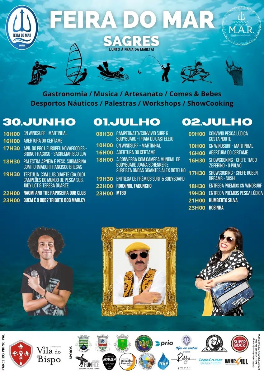 Programa da Festas do Mar 2023: 30 de Junho 10:00 - CN windsurf - Martinhal 16:00 - Abertura do Certame 17:30 - Apresentação do Projeto Europeu NovaFoodies 18:30 - Palestra Apneia e Pesca Submarina com Formador Francisco Bregas 19:30 - Tertúlia com Luís Duarte 22:00 - Naomi and The Raposeira Dub Club 23:00 - Quem é o Bob - Tributo a Bob Marley 1 de Julho 08:30 - Campeonato e Convivio Surg e Bodyboard - Praia do Castelejo 10:00 - CN Windsurf - Martinhal 16:00 - Abertura do certame 18:00 - A Conversa com Campeã Mundial de Bodyboard Joana Scheker e Surfista Ondas Gigantes Alex Botelho 19:30 - Entrega de prémios Surf e Bodyboard 22:00 - Concerto de Rouxinol Faduncho 23:00 - MT80 2 de Julho 09:00 - Convivio de Pesca Lúdica Costa Norte 10:00 - Cn Windsurf - Martinhal 16:00 - Abertura do certame 16:30 - Showcooking - Chefe Tiago Zeferino 17:30 - Showcooking - Chef Ruben Dreams 18:30 - Entrega Prémios Cn Windsurf 19:30 - Entrega Prémios Pesca Lúdica 21:00 - Humberto Silva 23:00 - Rosinha