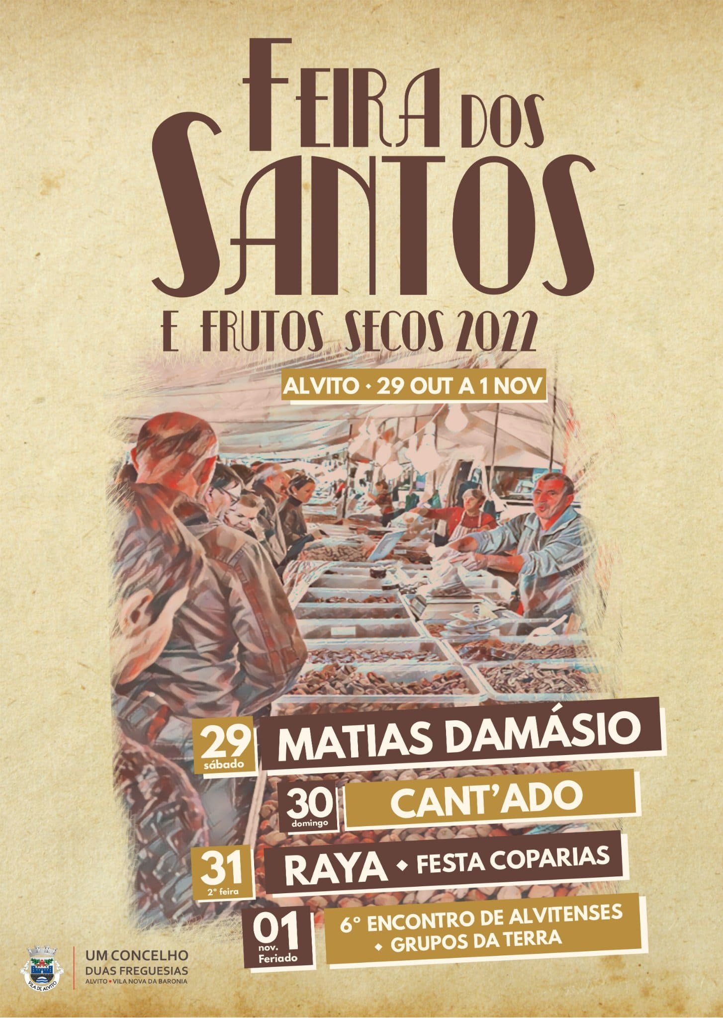 A 25ª Edição da Mostra de Serviços e Produtos Locais e Regionais, inserida na Feira dos Santos, ganha novas dinâmicas e reafirma a sua já longa tradição de espaço de comércio, de diversão, de encontro entre os naturais, residentes e visitantes, que nesta ocasião nos visitam. A Feira dos Santos, a mais antiga do Alentejo, vem-se afirmando localmente e vem marcando, cada vez mais, a agenda dos acontecimentos regionais a não perder. Pograma da Feira dos Santos: 29 de Outubro 09:00 - TranAlentejo Walking Festival 15:30 - Colóquio "Frutos Secos - Impacto do Setor na Economia Regional e Nacional" 16:00 - Abertura do Recinto da feira 18:00 - Cerimónia de inauguração Oficial 19:00 - Marchinha do Botequim 21:00 - Fil Maximus 22:30 - Matias Damásio 00:00 - Dupla Mete Cá Sets 02:00 - Dj Paulo B 04:00 - Dj Seven 30 de Outubro 17:00 - Banda da Aldeia 19:30 - Grupo Coral Os Rama Verde 20:00 - Tr3s & Roda 22:00 - Cant'ado 23:30 - Dj Mindless 31 de Outubro 15:00 - Da Ilha à Planicie 20:30 - Jorge Nice 22:30 - RAYA 00:00 - Festa Coparias - Dj Rui Gonçalves - Dj Garfield - Dj Porta Nova 1 de Novembro 10:00 - Walking Football 12:30 - 6º Encontro de alvitenses - Receção 13:00 - Almoço Convívio Animação Musical - Trio Alvoroço 16:30 - Atuação de Grupos Corais 18:00 - Ciranda 19:30 - De Moda em moda 21:00 - Campos do Alentejo