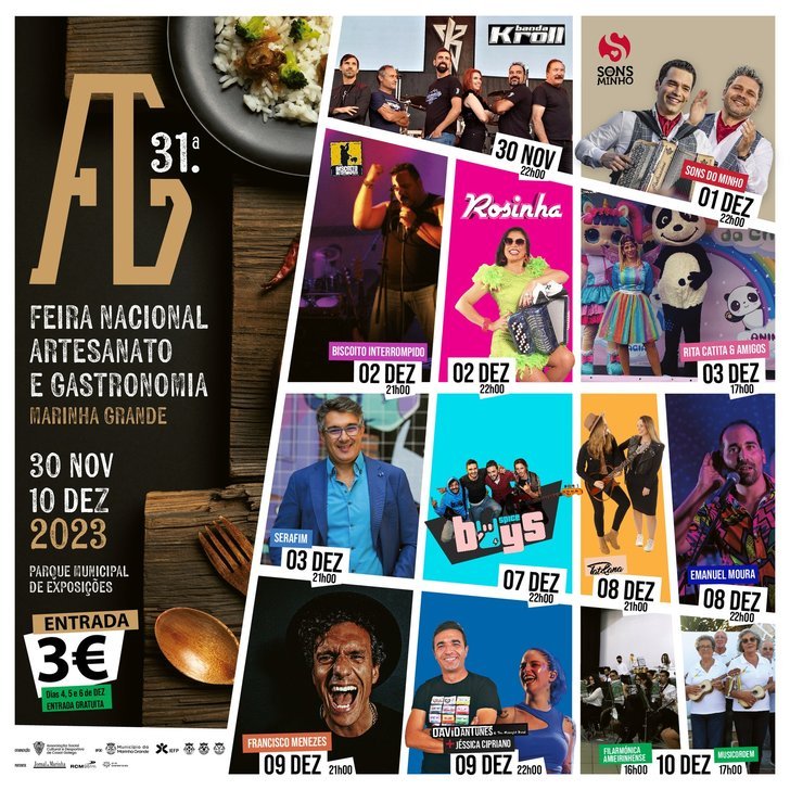 FEIRA NACIONAL DE ARTESANATO E GASTRONOMIA 30 de novembro a 10 de dezembro Parque Municipal de Exposições - Marinha Grande Horário: 30 de novembro . 18h00 às 24h00 Feriados e fins-de-semana . 12h00 às 24h00 Segunda-feira a quinta-feira . 19h00 às 24h00 Preço: 3 euros (por dia e com acesso aos espetáculos); entrada gratuita nos dias 4, 5 e 6 de dezembro 30 de novembro 18h00 . Inauguração 22h00 . Banda Kroll 1 de dezembro 22h00 . Sons do Minho 2 de dezembro 21h00 . Biscoito Interrompido 22h00 . Rosinha 3 de dezembro 17h00 . Rita Catita & Amigos (Espetáculo Infantil) 21h00 . Serafim 7 de dezembro 22h00 . Spice Boys 8 de dezembro 21h00 . Tat&Ana 22h00 . Emanuel Moura c/ banda 9 de dezembro 21h00 . Francisco Menezes 22h00 . David Antunes & The Midnight Band + Jéssica Cipriano 10 de dezembro 15h00 . Teatro dos Utentes do Centro de Dia e Centro de Convívio da A.S.C.D. Casal Galego 16h00 . Filarmónica Recreativa Amieirinhense Grupo de Cavaquinhos MusicOrdem