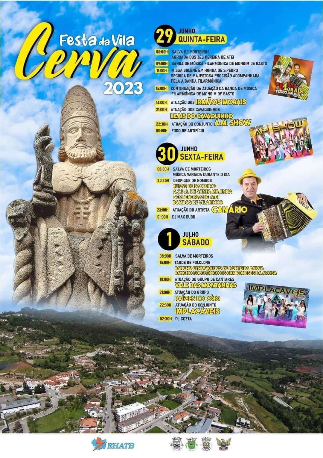 Ecrã completoEvento terminadoFesta da Vila 2023 - Cerva📅Dataquinta-feira, 29 de junho de 2023(3 dias)até sábado, 1 de julho de 2023📍LocalCerva, Vila Real, Vila Real (Vila Real)🗺️DireçõesWaze|Google MapsSobre este eventoFesta da Vila 2023 - CervaLocalização