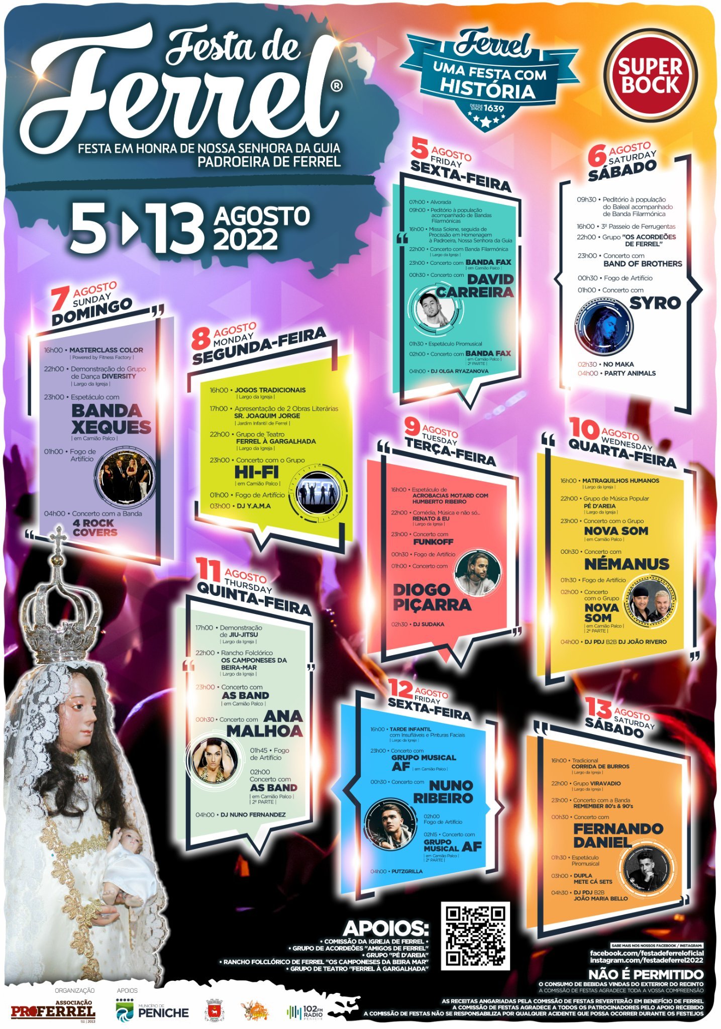 Conhece brevemente o programa e horários da Festa de Ferrel 2022: 5 de Agosto - David Carreira - Banda Fax - Olga Ryazanova 6 de Agosto Passeio de Ferrugentas - Syro - Band of Brothers - No Maka 7 de Agosto Masterclass Color - Xeques Orquestra - 4 Rock Covers 8 de Agosto Jogos Tradicionais - Grupo Hi-Fi - Dj YAMA 9 de Agosto Freestye de Moras - Diogo Piçarra - Funkoff - Dj Sudaka 10 de Agosto - Némanus - Grupo Novo Som - João Rivero 11 de Agosto - Ana Malhoa - As Band - Dj Nuno Fernandez 12 de Agosto - Nuno Ribeiro - Grupo AF - Putzgrilla 13 de agosto Corrida de Burros - Fernando Daniel - Banda Remember 80s & 90s - Dupla Mete Cá Sets - João Maria Bello