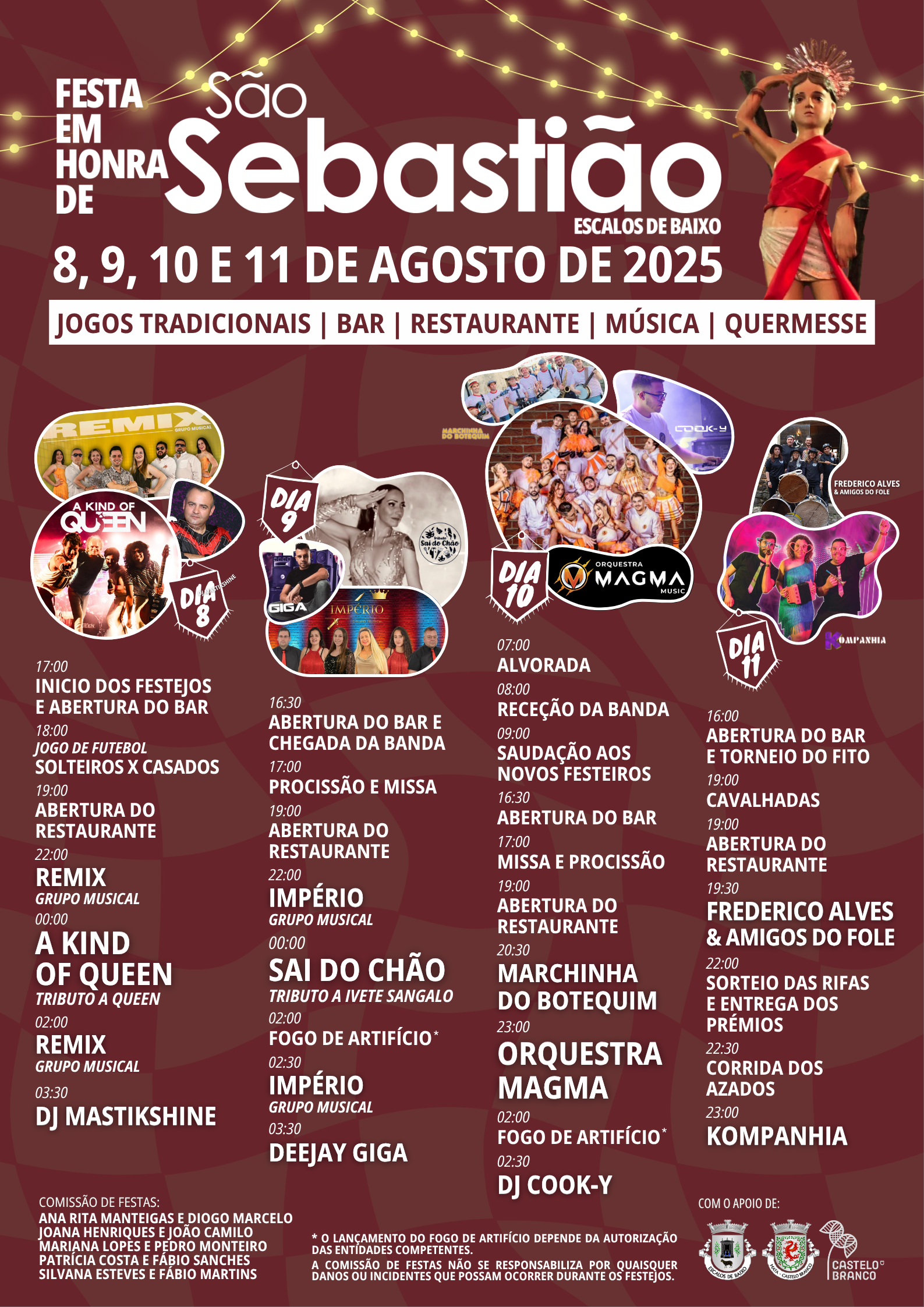 Diz-se, do conhecimento popular, que durante as Guerras da Independência a aldeia dos Escalos de Baixo foi poupada graças a São Sebastião. Atribui-se ao “defensor da fome, pestes e guerras”, um nevoeiro que encobriu a aldeia e afastou, assim, as tropas franco-espanholas que vinham invadindo os territórios vizinhos. Pelo feito, foram feitas várias obras e oferendas, resultando também daí esta festa em sua homenagem. Este ano, o cartaz contará com: Orquestra MAGMA; Sai do Chão (Tributo a Ivete Sangalo); A Kind of Queen (Tributo a Queen); DJ Giga, entre outros.