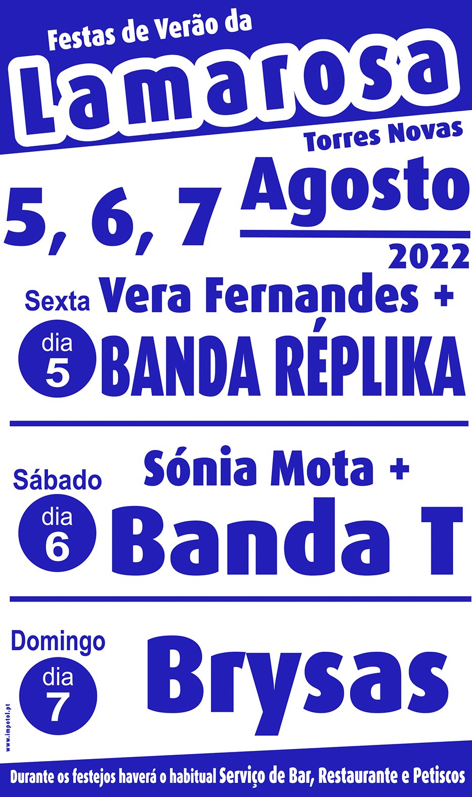 A não perder a grande Festa de Verão da Lamarosa 2022 com um cartaz excecional!!! Sexta, dia 5 Agosto 17h00 Abertura do Bar 20h00 Abertura do Restaurante 21h:30 Baile com Vera Fernandes 23h30 Banda Replika Sábado, dia 6 Agosto 16h00 Abertura do Bar 19h00 Abertura do Restaurante 21h30 Baile com Sónia Mota 23h30 Banda T Domingo, dia 7 Agosto 16h00 Abertura do Bar 19h00 Abertura do Restaurante 21h00 Banda Brysas Convidem os vossos amigos e familiares e contem com mais um ano de muita música e de muita diversão Há boa comida, boa bebida, boa música para todos os gostos, boa gente, e diversão garantida!!! Siga !!! " Todos juntos fazemos a Festa"