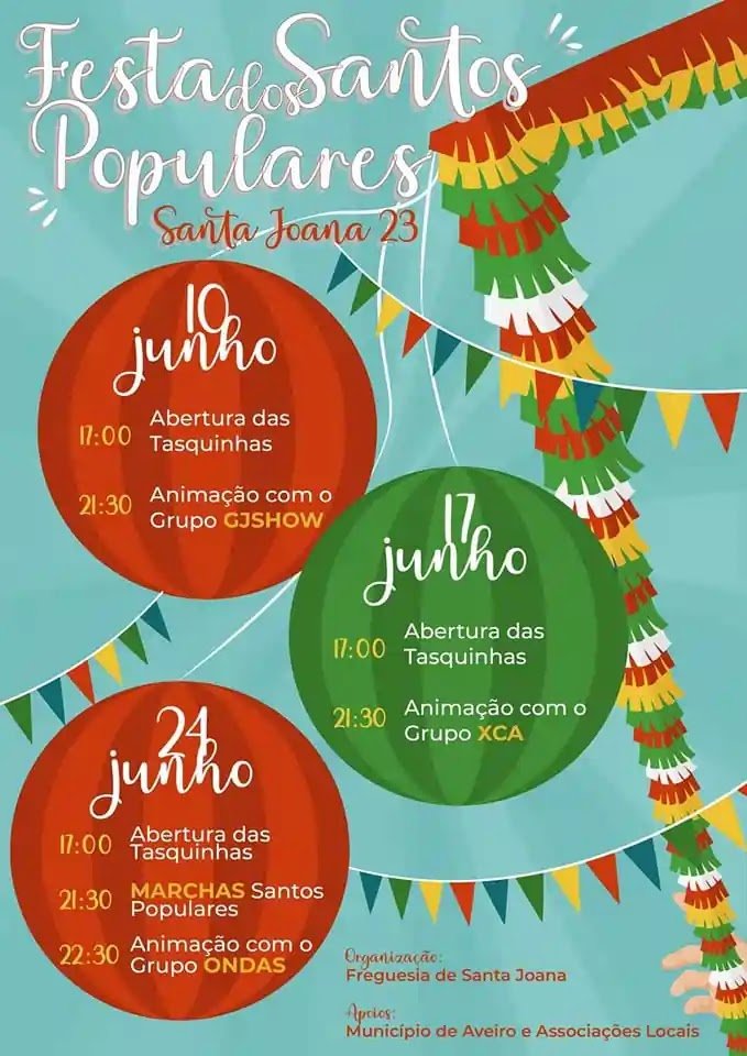 Programa da Festa dos Santos Populares 2023 - Santa Joana: 10 de Junho 17:00 - Abertura das Tasquinhas 21:30 - Animação com o Grupo GJShow 17 de Junho 17:00 - Abertura das Tasquinhas 21:30 - Animação com o Grupo XCA 24 de Junho 17:00 - Abertura das tasquinhas 21:30 - MArchas Santos Populares 22:30 - Animação com o Grupo Ondas