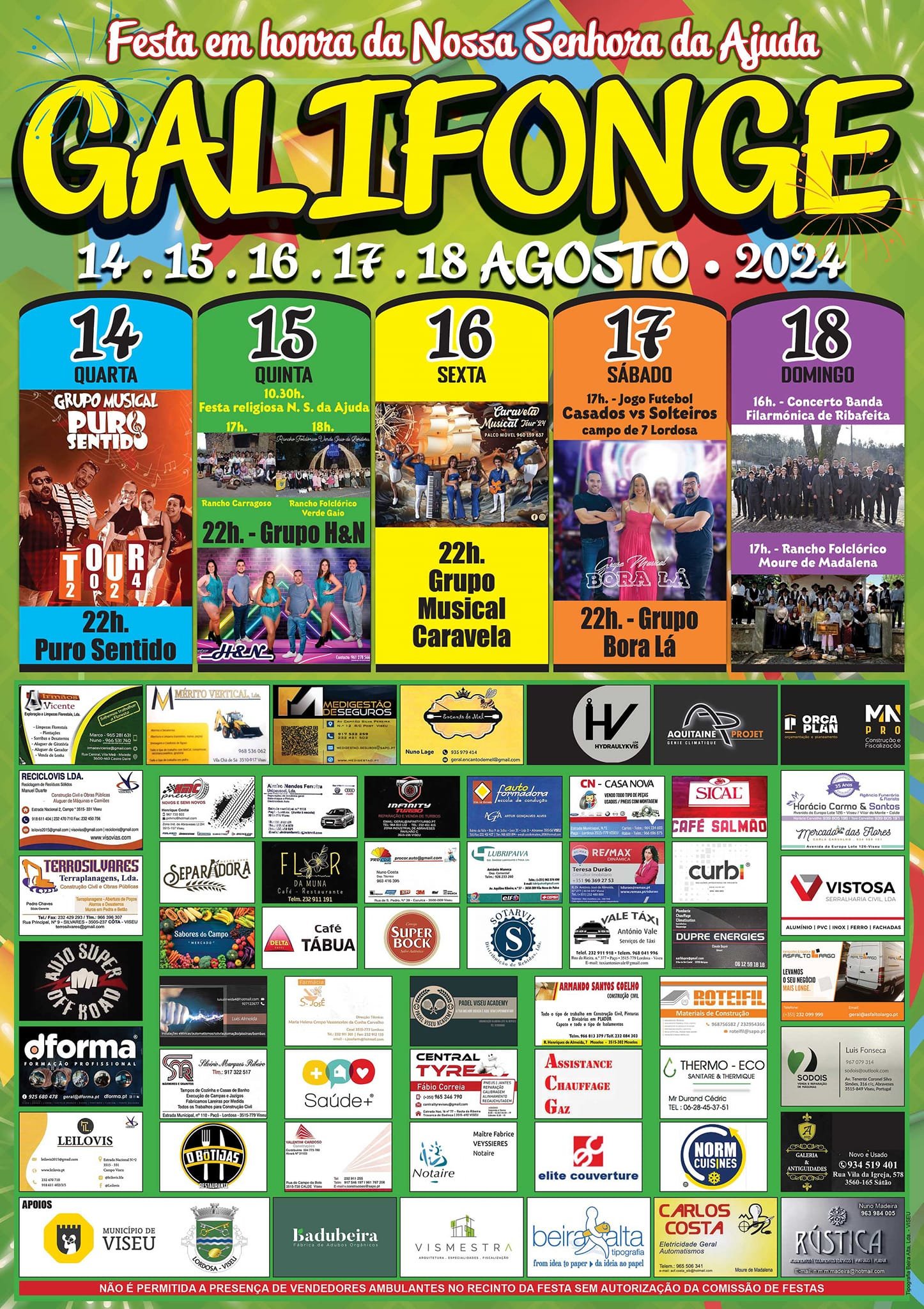 Festa em Honra de Nossa Senhora da Ajuda 2024 - Galifonge Programa: 14 de Agosto (Quarta-feira) 22h: Grupo Puro Sentido 15 de Agosto (Quinta-feira) 10h30: Festa religiosa em honra de Nossa Senhora da Ajuda 17h: Rancho Carragoso 18h: Rancho Folclórico Verde Gaio 22h: Grupo Musical H&N 16 de Agosto (Sexta-feira)22h: Grupo Caravela Musical 17 de Agosto (Sábado) 17h: Jogo de Futebol - Casados vs Solteiros (Campo de 7 Lordosa) 22h: Grupo Musical Bora Lá 18 de Agosto (Domingo) 16h: Concerto da Banda Filarmónica de Ribafeita 17h: Rancho Folclórico Moure de Madalena