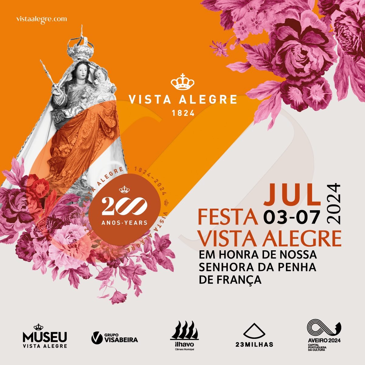 Festa em Honra de Nossa Senhora da Penha de França 2024 - Ílhavo Festa Vista Alegre 2024 - Ílhavo Programa: 3 de Julho 18:00 - Oração do terço em honra a Nossa Senhora da Penha de França, na Capela da Vista Alegre 18:00 - Abertura da Feira do Livro · Jardins da Creche 18:00 - Apresentação de Livro “A Fábrica Alegre”, pela autora Adélia Carvalho 19:00 - Momento Musical pelo Grupo Música Nova 21:30 - Maria Café - Concerto · Largo da Fábrica · Entrada livre 4 de Julho 18:00 - Apresentação do livro “No Reino do Rio”, pelo autor Manuel Morgado Em “Vista Alegre - O Reino do Rio – The River kingdom” 19:00 - Inauguração das Exposições Temporárias · Museu Vista Alegre · Entrada livre Vozes da Fábrica - Vista Alegre e as suas gentes Olhar para o Infinito - Vista Alegre e a arte de ilustrar 21:30 - 200 anos - Por Baixo da História · Grupo de Teatro Ribalta · Largo da Fábrica (M/6) · Entrada livre 5 de Julho 18:00 - Apresentação de livro · Feira do Livro Cadernos de Viagem da vista Alegre, pelos autores Victoria Semykina e João Catarino 18:00 - Arruada pelas ruas do Bairro Operário e no Largo da Fábrica 19:00 - Poesia ao Entardecer, por Jorge Neves · Jardins da Creche 22:00 - Carlão - Concerto · Largo da Fábrica · Entrada livre 6 de Julho 10:00 - Hastear da Bandeira da Fábrica da Vista Alegre · Largo da Fábrica Entrada livre 10h-18:00 - Oficina de Ilustração · Teatro da Vista Alegre · As cores da Vista Alegre, com a orientação de Victoria Semykina 10h30-18:00 - Animação Infantil · Jardins da Creche 10h-18:00 - Torneio de Futebol · Escalão Veteranos · Campo de Futebol Municipal da Vista Alegre 10:00 - SC Vista Alegre Veteranos VS FC Porto Vintage 11:30 - Sporting CP Veteranos VS Sport Saudade e Benfica 15:30 - Apuramento de 3º e 4º Classificado 17:00 - Apuramento de 1º e 2º Classificado 2,00€ · Donativo a reverter na totalidade para os Bombeiros Voluntários de Ílhavo 11:00 - Momento musical com a Brass Band da Filarmónica Gafanhense Feira do Livro 15:30 - Sessão de histórias · Feira do Livro A Biblioteca Municipal de Ílhavo vai à Vista Alegre... com uma Hora do Conto Especial 16:00 - Teatro Infantil · Escola de Teatro Ribalta · Teatro da Vista Alegre (M/6) 17:30 - Inauguração do Monumento Comemorativo dos 200 anos da Vista Alegre Largo da Fábrica 19:00 - Conversa · Feira do Livro Conversa com os ilustradores João Catarino e Pedro Sousa Pereira e moderação de Ju Godinho e Eduardo Filipe (Ilustrarte) 19:00 - Arruada pelas ruas do Bairro Operário e no Largo da Fábrica 22:00 - Carminho - Concerto · Largo da Fábrica · Entrada livre 00:00 - Fogo de Artifício 7 de Julho 10:00 - Arruada pelas ruas do Bairro Operário e no Largo da Fábrica 11:00 - Missa com o Orfeão da Santa Casa da Misericórdia de Ílhavo Capela de Nossa Senhora da Penha de França 10h-18:00 - Animação Infantil · Jardins da Creche 11:00 - Sessão de Histórias · Feira do Livro (M/3) Era não era …, por Miguel Gouveia 15:30 - Sessão de Histórias · Feira do Livro (M/3) A Fábrica Alegre, pela autora Adélia Carvalho 17:00 - Procissão · Percorrendo as ruas da fábrica e do Bairro Operário, acompanhada pela Banda dos Bombeiros Voluntários de Ílhavo - Música Nova e pela Banda Filarmónica Gafanhense. 19:00 - Clube de Leitura Xylocopa · Feira do Livro 20:00 - DJ BLYTZ · Largo da Fábrica · Entrada livre