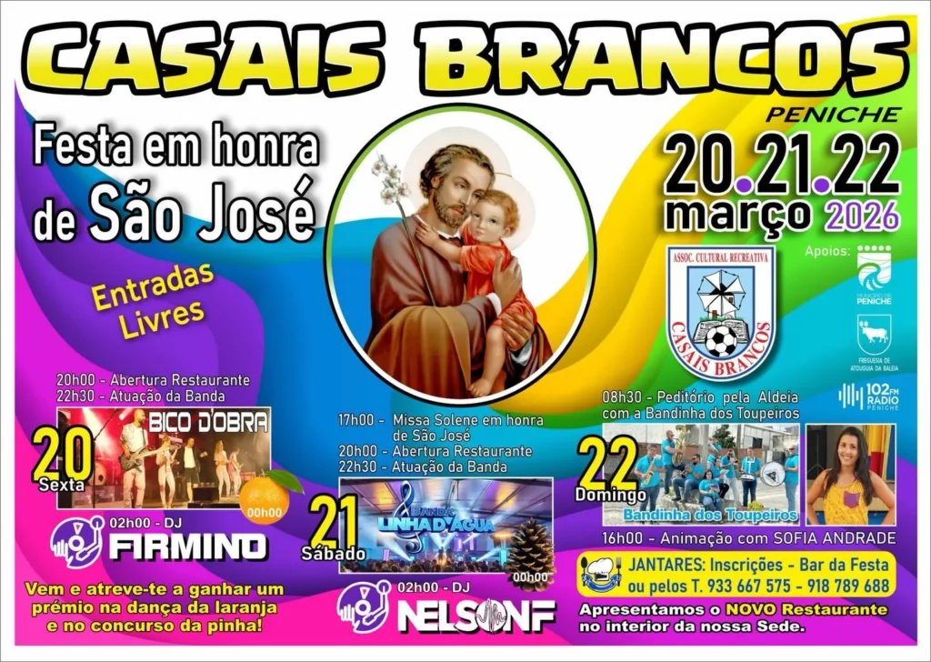 Festa em honra de São José com várias atividades, incluindo missa, atuações de bandas, e animação.