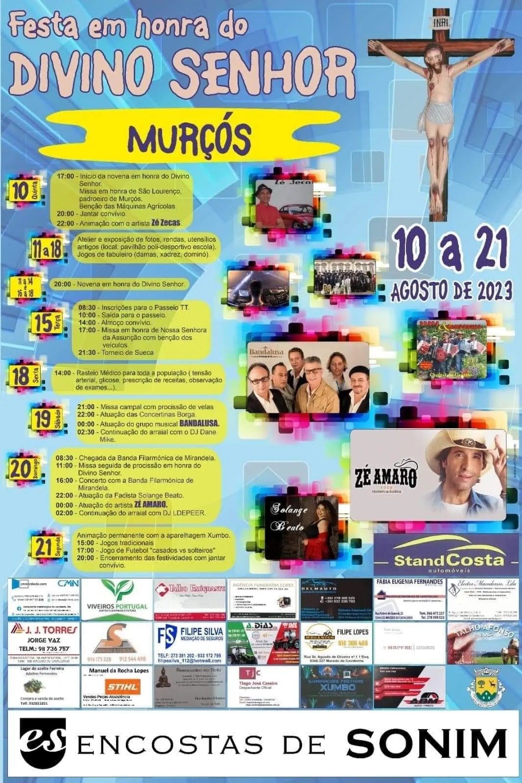 Programa das Festa em Honra do Divino Senhor 2023 - Murçós: 10 de Agosto 17:00 - Inicio da Novena 20:00 - Jantar Convivio 22:00 - Animação com o artista Zé Zecas 11 a 14 e 16 a 18 Agosto 20:00 - Novena em horna do Divino Senhor 15 de Agosto 08:30 - Inscrições para o Passeio TT 10:00 - Saida para o passeio 14:00 - Almoço Convivio 17:00 - Missa me honra de Nossa Senhora da Assunção 21:30 - Torneio de Sueca 18 de Agosto 14:00 - Rasteio Médico 19 de Agosto 21:00 - Missa campal com procissão de velas 22:00 - Atuação das concertinas Borga 00:00 - Atuação do grupo musical Bandalusa 02:30 - Continuação do arraial com o Dj Dane Mike 20 de Agosto 08:30 - Chegada da BAnda Filarmónica de Mirandela 11:00 - Missa seguida de procisão 16:00 - Concerto com a Banda Filamronica de Mirandela 22:00 - Atuação do fadista Solange Beato 00:00 - Atuação do Artista Zé Amaro 02:00 - Continuação do arraial com Dj LDeeper 21 de Agosto Animação permanente 15:00 - Jogos tradicionais 17:00 - Jogo de futebol "Casados vs Solteiros" 20:00 - Encerramento das festividades com jantar convivio