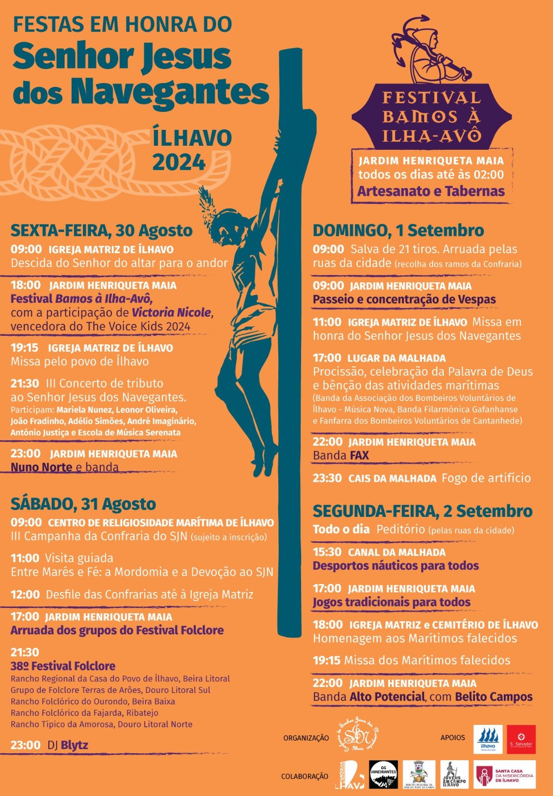 Festa em Honra do Senhor Jesus dos Navegantes 2024 - Ílhavo Programa: 30 agosto, sexta-feira 09h00 - Descida do Senhor do altar para o andor |Igreja Matriz de Ílhavo 18h00 - Festival Bamos á Ilha-Avô |Jardim Hneriqueta Maia 19h15 - Missa pelo povo de Ílhavo | Igreja Matriz de Ílhavo 21h30 - III Concerto de tributo ao Senhor Jesus dos Navegantes 23h00 - Nuno Norte e banda | Jardim Henriqueta Maia 31 agosto, sábado 09h00 - III Campanha da Confraria do SJN | Centro de Religiosidade Marítima de Ílhavo 11h00 - Visita guiada entre Marés e Fé: a Mordomia e a Devoção ao SJN 12h00 - Desfile das Confrarias até à Igreja Matriz 17h00 - Arruada dos Grupos do Festival do Folclore | Jardim Henriqueta Maia 21h30 - 38º Festival Folclore 23h00 - DJ Blytz 1 setembro, domingo 09h00 - Salva de 21 tiros. Arruada pelas ruas da cidade 09h00 - Passeio e concentração de Vespas | Jardim Henriqueta Maia 11h00 - Missa em honra do Senhor Jesus dos Navegantes | Igreja Matriz de Ílhavo 17h00 - Procissão, celebração da Palavra de Deus e bênção das atividades marítimas | Lugar da Malhada 22h00 - Banda FAX |Jardim Henriqueta Maia 23h30 - Fogo de artifício | Cais da Malhada 2 setembro, segunda-feira Todo o dia - Peditório 15h30 - Despertos náuticos para todos | Canal da Malhada 17h00 - Jogos tradicionais para todos | Jardim Henriqueta Maia 18h00 - Homenagem aos Marítimos falecidos | Igreja Matriz de Ílhavo 19h15 - Missa dos Marítimos falecidos 22h00 - Banda Alto Potencial, com Belito Campos | Jardim Henriqueta Maia