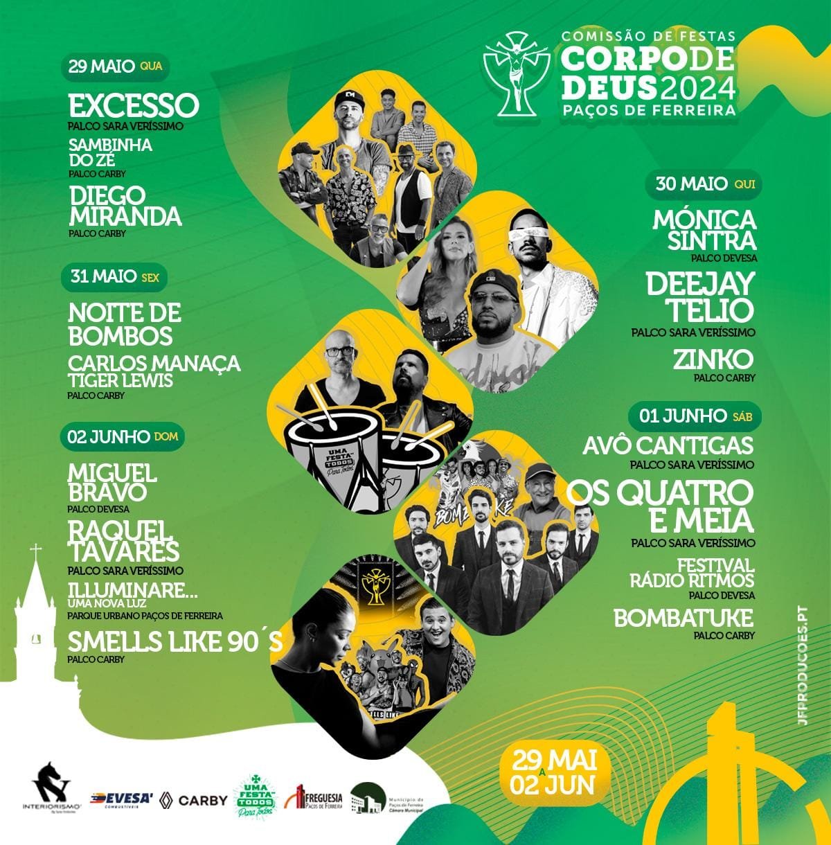 Festas de Corpo de Deus 2024 - Paços de Ferreira Programa: 29 de Maio Excesso Diego Miranda Sambinha do Zé 30 de Maio Deejay Telio Mónica Sintra Zinko 31 de Maio Noite de Bombos Carlos Manaça Tiger Lewis 1 de Junho Os Quatro e Meia Avô Cantigas Festival Rádio Ritmos Bombatuke 2 de Junho Miguel Bravo Raquel Tavares Illuminare Smells Like 90's