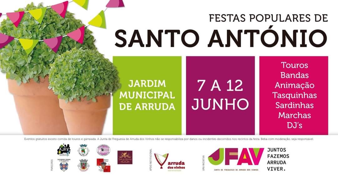 Festas de Santo António 2023 - Arruda dos Vinhos // Quarta-feira (07.06) 20H30 » Arraial com Nuno Carvalho // Quinta-feira (08.06) 20H30 » Arraial com Banda Turno da Noite // Sexta-feira (09.06) 20H30 » Arraial com Nuno Pinto 22H00 » Afonsinhos 00H00 » DJ Macarroni // Sábado (10.06) 18H00 » Demonstração de ginástica pelo Oeste Clube de Ginástica 19H30 » Apresentação de carro de rali – Jorge Luís 20H30 » Arraial com Nuno Pinto 22H00 » Puro Acaso 00H00 » Duo Romântico Fábio & Afonso – DJ Set // Domingo (11.06) 10H30 » Caminhada de Santo António 18H00 » Corrida de Touros Mista (bilhetes à venda nos locais habituais) 20H30 » Concerto da Banda da Santa Casa de Arruda dos Vinhos 22H00 » Arraial com Bento Silva Band Secadegas // Segunda (12.06) 19H00 » Marchas Populares 20H30 » Sardinhada & Porco no Espeto 21H00 » Arraial com Raúl & Eu TODOS OS DIAS: Tasquinhas pelas associações arrudenses