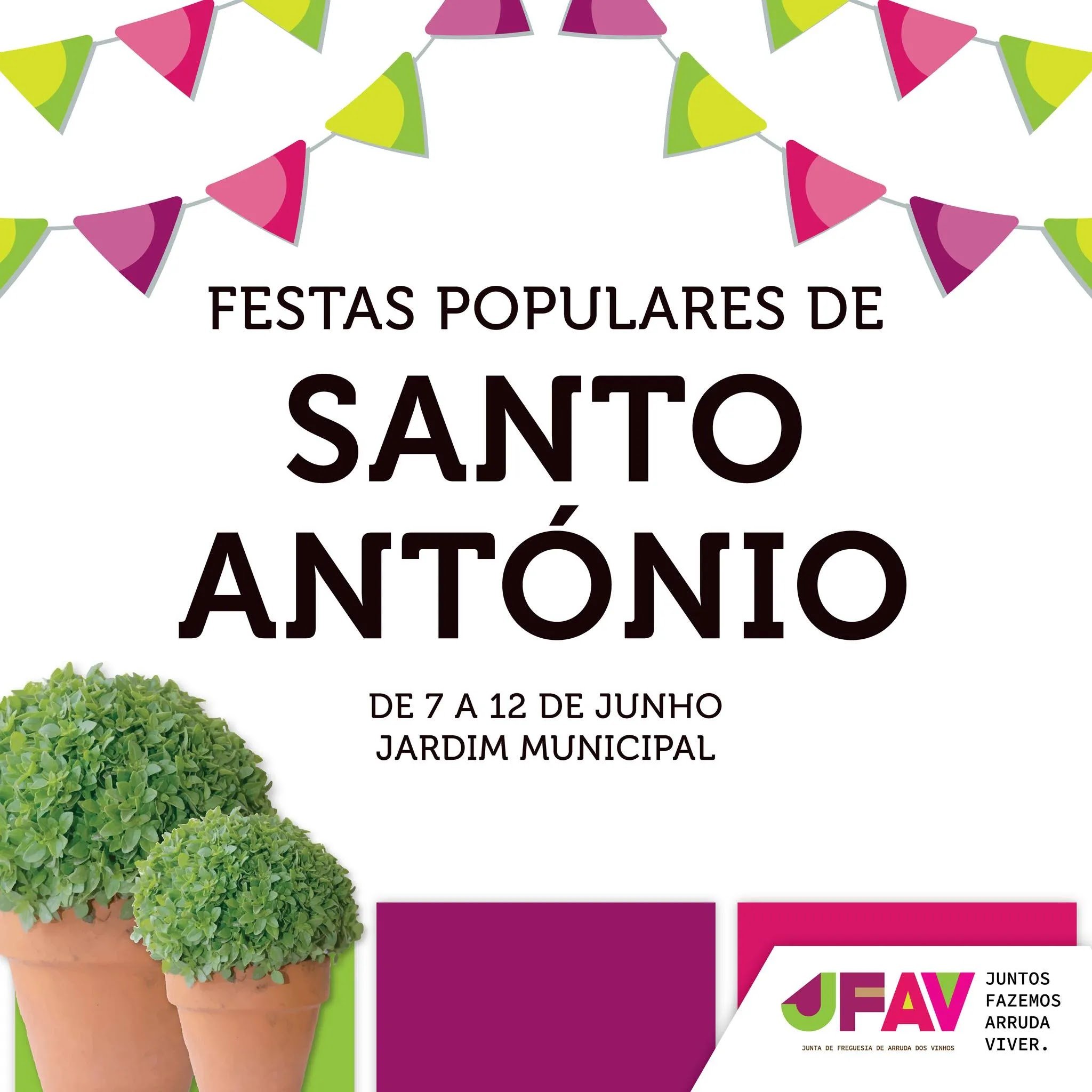 Festas de Santo António 2024 - Arruda dos Vinhos Programa: 7 de Junho 20:30 - Arraial com Cristais da Noite 23:30 - Dj Maggie Rose 8 de Junho 20:30 - Arraial com Chaparral Band 23:30 - Dj Advorgado e Friends 9 de Junho 09:30 - Caminhada 20:30 - Noite de Fados 00:00 - Dj Luis Pinheiro 10 de Junho 19:00 - Oeste Clube de Ginástica 20:30 - Arraial com Banda TOP 11 de Junho 19:30 - DJ KASAKA 12 de Junho 19:00 - Marchas Populares 20:30 - Sardinhada e porco no espeto 21:00 - Arraial com EU + Empregados