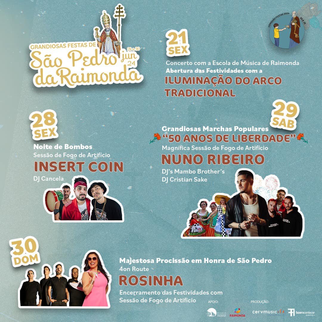 Festas de São Pedro 2024 - Raimonda Programa: SEXTA FEIRA (dia 21/06/2024) 21:30h - Concerto com a escola de música de Raimonda 22:00h – Abertura das festividades com a iluminação do arco tradicional 22:15h - Sessão de Fogo de Artifício SEXTA FEIRA (dia 28/06/2024) 22:00h – Noite de bombos 00:00h - Sessão de Fogo de Artifício 00:30h – Insert Coin 02:00h – DJ Cancela SÁBADO (dia 29/06/2024) 09:00h – Arruada de bombos 18:00h – Eucaristia em honra de São Pedro 21:30h - Grandiosas Marchas Populares “50 ANOS DE LIBERDADE” 00:00 – Magnífica Sessão de Fogo de Artifício 00:30 – Nuno Ribeiro 02:00 – DJ’s Mambo Brother’s 03:00 - DJ Cristian Sake DOMINGO (dia 30/06/2024) 08:30h – Entrada da Banda Musical de Lousada e Banda Marcial de Fermentelos 10:00h – Concerto das Bandas Filarmónicas; 11:00h – Eucaristia solene em honra do Padroeiro São Pedro 15:30h – Concerto das Bandas Filarmónicas; 18:00h – Majestosa Procissão em Honra de São Pedro 20:00h – Despedida das bandas Filarmónicas e passagem de testemunho à nova Comissão de Festas 22:00h – 4on Route 23:00h – Rosinha 00:30h – Encerramento das festividades com Sessão de Fogo de Artifício 01:00h - Mel