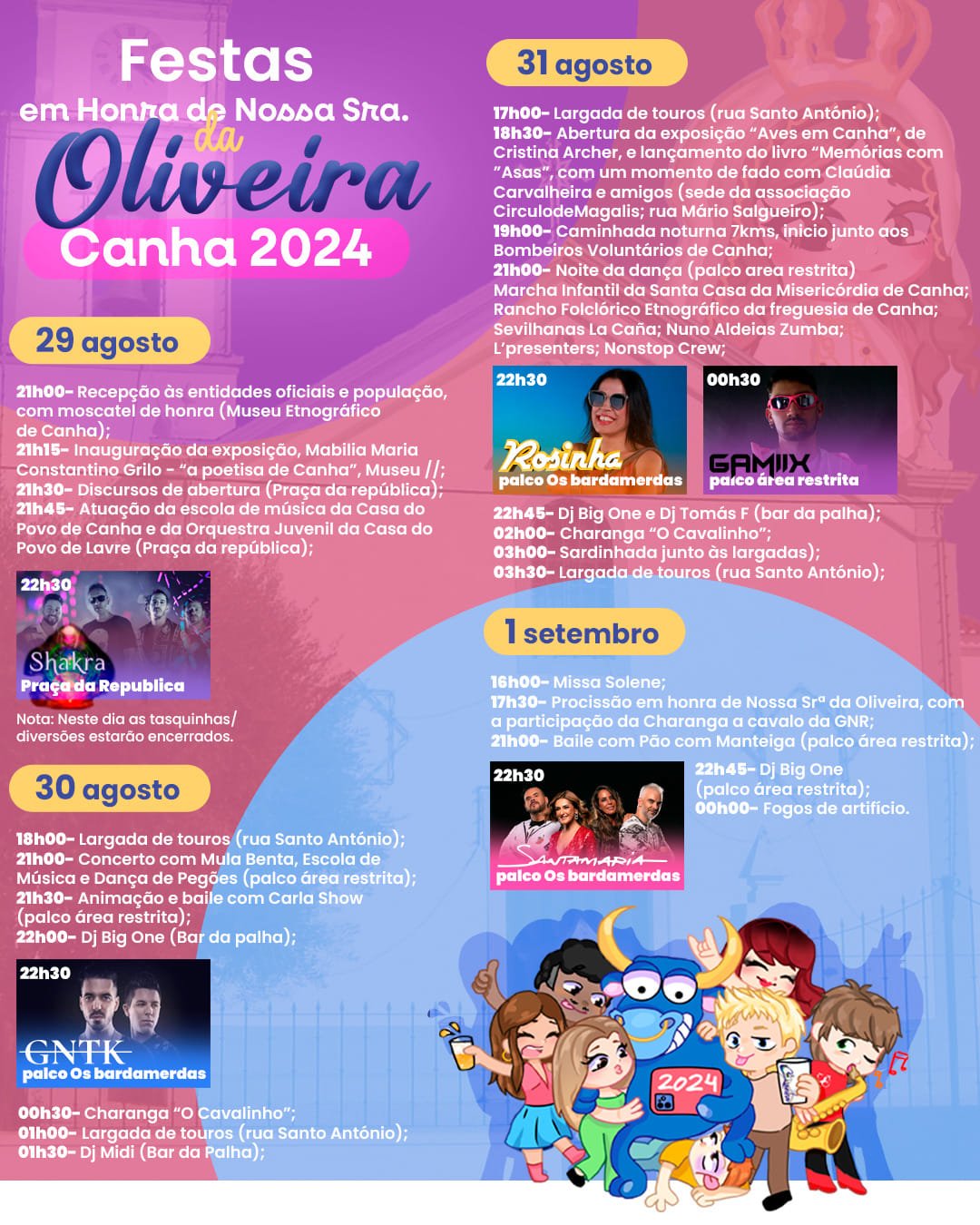 Festas em Honra de Nossa Senhora da Oliveira 2024 - Canha Programa: 29 de Agosto 21:00 - Recepção às entidades oficiais 21:15 - Inauguração da exposição 21:30 - Discursos de abertura 21:45 - Atuação da escola de música 22:30 - Shakra 30 de Agosto 18:00 - Largada de touros 21:00 - Concerto com Mula Baenta 21:30 - Animação e baile ocm Carla Show 22:00 - Dj Big One 22:30 - Concerto com GNTK 00:30 - Charanga "O Cavalinho" 01:00 - Largada de Touros 01:30 - Dj Midi 31 de Agosto 17:00 - Largada de touros 18:30 - Abertura da exposição 19:00 - Caminhada Norturna 7kms 21:00 - Noite da dança 22:30 - Concerto com Rosinha 22:45 - Dj Big One e Dj Tomás F 00:30 - GMIIX 02:00 - Charanfa "O Cavalinho" 03:00 - Saridnhada junto às largadas 03:30 - Largada de touros 1 de Setembro 16:00 - Missa solene 17:30 - Procissão em horna da Nossa Senhora da Oliveira 21:00 - Baile com Pão com Manteiga 22:30 - Santamaria 22:45 - Dj Big One 00:00 - Fogos de Artificio
