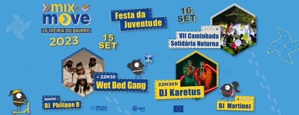 A edição de 2023 do Mix&Move Oliveira do Bairro foi apresentada no passado dia 27 de julho, pela autarquia local. A iniciativa, que se vai realizar entre 15 e 24 de setembro, vai celebrar, como tem sido hábito, a Semana Europeia da Mobilidade (SEM), juntando ainda a Festa da Juventude e mais uma série de atividades. Jorge Pato, Vice-Presidente da Câmara, e Susana Martins, responsáveis pela área do Ambiente e Juventude do Município de Oliveira do Bairro, respetivamente, apresentaram o programa da edição deste ano. Na ocasião, os autarcas convidaram a população do Concelho a decorarem as janelas e varandas das suas residências, à semelhança de anos anteriores, com os tradicionais moinhos de vento, que se têm assumido como o símbolo da iniciativa, ou com elementos alusivos ao tema da SEM deste ano: “Eficiência Energética”. Das muitas atividades do Mix&Move 2023, destacam-se o Dia Europeu Sem Carros e a VII Caminhada Solidária Noturna, no dia 16 de setembro, os Municípios Sem Fronteiras (dias 22 e 23), a Corrida de Carrinhos de Rolamentos (dia 23) e a habitual atividade de cicloturismo (dia 24). Provavelmente a atividade mais emblemática do Mix&Move será a Caminhada Solidária Noturna, que vai para a sétima edição e cuja receita voltará a ser entregue à Associação Humanitária dos Bombeiros Voluntários de Oliveira do Bairro, desta vez para apoiar a instalação de um campo de treino para combate a incêndios urbanos e industriais. Recorde-se que a edição de 2022 angariou 21.050 euros, destinados à aquisição de uma ambulância de emergência pré-hospitalar. As inscrições poderão ser feitas através de formulário disponível no site e redes sociais do Município. O donativo da inscrição é entregue diretamente à associação, no dia da caminhada, e dá direito ao habitual kit de participação, que inclui um saco, a t-shirt exclusiva da iniciativa e os enfeites de néon. Relativamente ao Dia Europeu Sem Carros, as atividades, totalmente gratuitas, vão decorrer na Av. Dr. Abílio Pereira Pinto e vão passar por insufláveis, jogos didáticos, minigolfe, “Escola Segura” – GNR, animação de rua, experiências científicas, rastreios de saúde e atividades desportivas, entre outras. A Festa da Juventude, que vai decorrer uma vez mais na Praça do Município, integra também o programa da iniciativa e contará com os concertos de Wet Bed Gang (dia 15 de setembro) e Karetus (dia 16), na Praça do Município. Destaque ainda para as atuações do DJ Philippe D (dia 15), DJ Martinez (dia 16), DJ Renas (dia 22) e DJ Jonny Six (dia 23). Ao longo da semana, vão decorrer várias atividades desportivas e culturais por toda a cidade de Oliveira do Bairro, com destaque para a Praça do Município.
