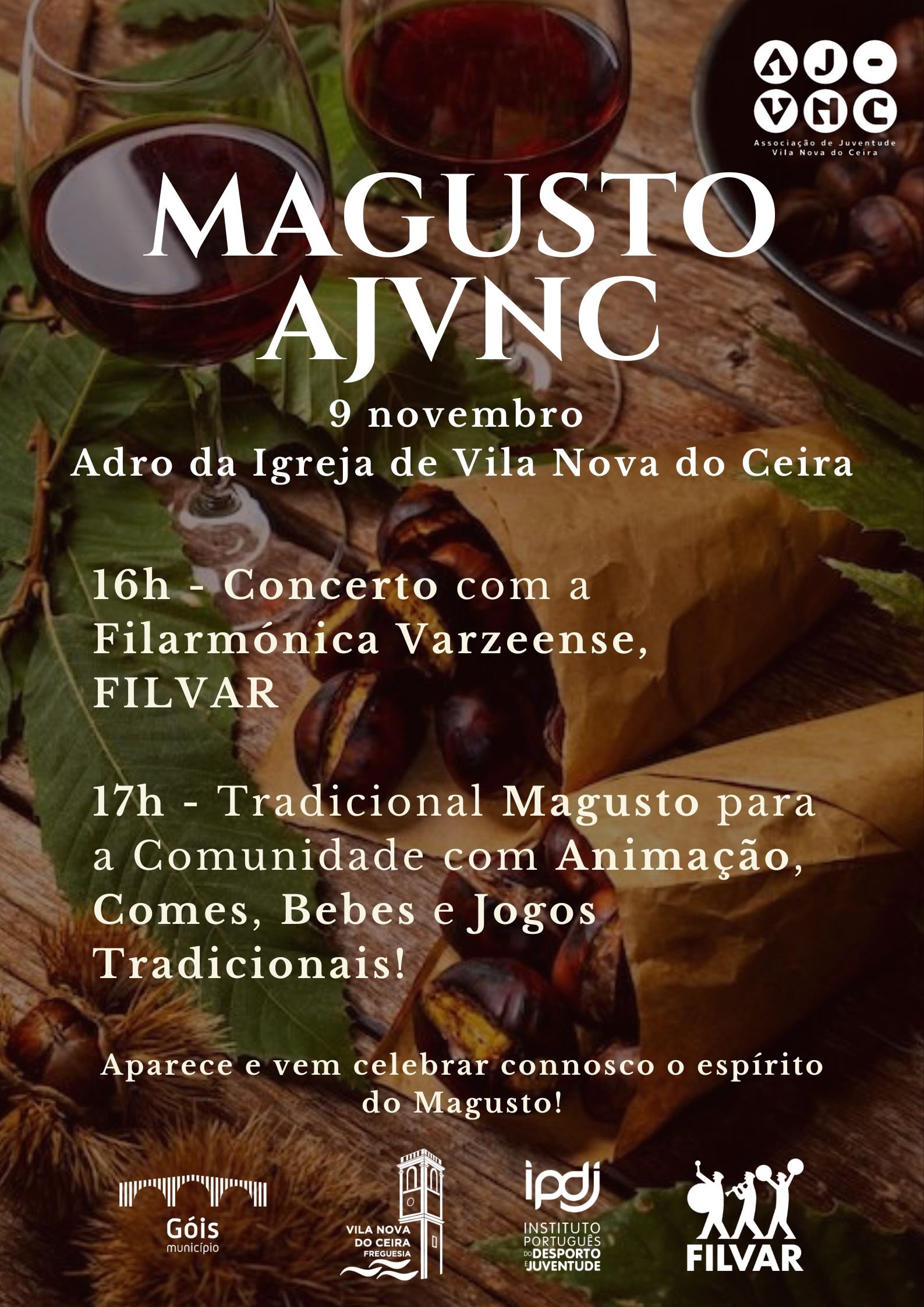 MAGUSTO AJVNC ?? O nosso tradicional Magusto está de volta! ? No próximo dia 9 de novembro, domingo, a partir das 16h, aparece no Adro da Igreja de Vila Nova do Ceira e vem celebrar connosco o verdadeiro espírito do Magusto! ? Este ano, além das deliciosas castanhas, haverá animação, comes, bebes, jogos tradicionais, e ainda um concerto especial da nossa Filarmónica Varzeense, FILVAR! ?? Traz a família, os amigos e boa disposição, nós tratamos do resto! Esperamos por ti! ?