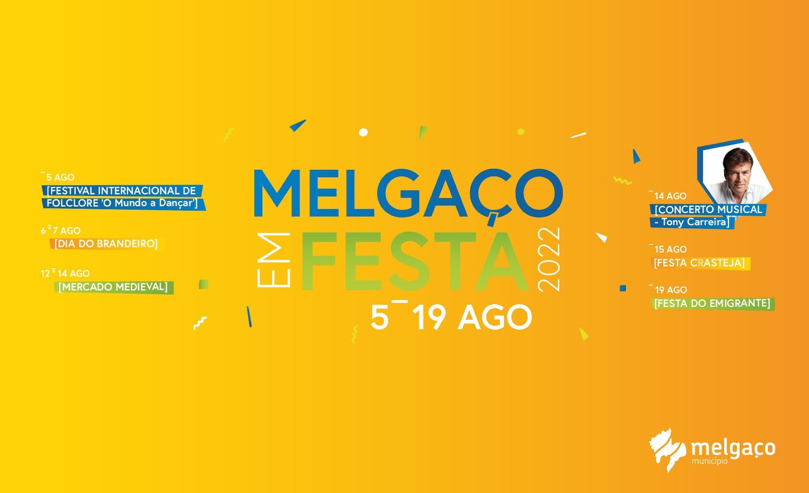 Conhece aqui o programa da Melgaço em Festa: 5 de agosto 22h00 - Festival Internacional de Folclore O Mundo a Dançar (Melgaço) 6 e 7 de agosto Dia do Brandeiro (Branda da Aveleira) 12 a 14 de agosto Mercado Medieval (Melgaço) 14 de Agosto Concerto musical com Tony Carreira (Melgaço) 15 de agosto Festa Crasteja (Castro Laboreiro) 19 de agosto Festa do Emigrante (Melgaço)