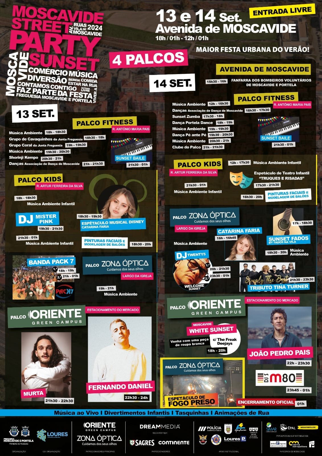 Moscavide Street Party Sunset 2024 - Moscavide ? Dia 13 de setembro, sexta-feira: ⤵ ? PALCO ORIENTE GREEN CAMPUS - Estacionamento do Mercado de Moscavide:️ ⤵️ ? Murta ⏰️ 21h30 às 22h30 ? Fernando Daniel ⏰️ 22h30 às 00h00 ? PALCO ZONA ÓPTICA - Largo da Igreja de Moscavide: ⤵️ ? Banda Pack7 (1º Parte) ⏰️ 18h00 às 19h00 ? Música Ambiente ⏰️ 19h00 às 21h00 ? Banda Pack7 (2º Parte) ⏰️ 21h00 às 01h00 ? PALCO KIDS - Rua Artur Ferreira da Silva: ⤵️ ? Música Ambiente Infantil ⏰️ 18h00 às 18h30 ? Espetáculo Musical Disney com Catarina Faria⏰️ 18h30 às 19h30 ? DJ Mister Pink - Infantil ⏰️ 19h30 às 21h30 ? Música Ambiente Infantil ⏰️ 21h30 às 01h00 ? Pinturas Faciais e Modelagem de Balões ⏰️ 18h30 às 20h00 ? PALCO FITNESS - Rua António Maria Pais: ⤵️ ? Música Ambiente ⏰️ 18h00 às 18h30 ? Grupo de Cavaquinhos da Junta de Freguesia ⏰️ 18h30 às 19h00 ? Grupo Coral da Junta de Freguesia ⏰️ 19h00 às 19h30 ? Música Ambiente ⏰️ 19h30 às 20h30 ? Shorinji Kempo ⏰️ 20h30 às 21h00 ? Espetáculo de Dança Associação De Dança De Moscavide ⏰️ 21h00 às 21h30 ? Sunset Baile ⏰️ 21h30 às 01h00 ? Dia 14 de setembro, sábado: ⤵ ? ABERTURA - Avenida de Moscavide: ⤵️ ? Fanfarra dos Bombeiros Voluntários de Moscavide e Portela ⏰️ 15h30 às 16h00 ? PALCO ORIENTE GREEN CAMPUS - Estacionamento do Mercado de Moscavide:️ ⤵️ ? Moscavide White Sunset c/ TheFreakDeejays⏰️ 18h00 às 20h30 (Venha com uma peça de roupa branca) ? João Pedro Pais ⏰️ 22h00 às 23h30 ? Festa M80 Rádio - Portugal ⏰️ 23h45 às 01h00 ? PALCO ZONA ÓPTICA - Largo da Igreja de Moscavide: ⤵️ ? Música Ambiente ⏰️ 12h00 às 16h00 ? Catarina Faria ⏰️ 16h00 às 16h45 ? Sunset Fados – By Fados na Vila ⏰️ 17h00 às 18h30 ? Música Ambiente ⏰️ 18h30 às 20h00 ? DJ Twenty5 (1º Parte) ⏰️ 20h00 às 21h30 ? Simply The Best Tributo Tina Turner ⏰️ 21h30 às 23h30 ? DJ Twenty5 (2º Parte) ⏰️ 23h30 às 01h00 ? PALCO KIDS - Rua Artur Ferreira da Silva: ⤵️ ? Música Ambiente Infantil ⏰️ 12h00 às 17h30 ? Espetáculo de Teatro Infantil “Truques e Risadas” 17h30 às 21h30 ? Música Ambiente Infantil 21h30 às 01h00 ? Pinturas Faciais e Modelagem de Balões ⏰️ 16h30 às 20h00 ? PALCO FITNESS - Rua António Maria Pais: ⤵️ ? Música Ambiente ⏰️ 12h00 às 16h30 ? Espetáculo de Dança Associação de Dança de Moscavide ⏰️ 16h30 às 17h30 ? Sunset Zumba ⏰️ 17h30 às 18h00 ? Espetáculo de Dança Portela Dance ⏰️ 18h00 às 19h00 ? Música Ambiente ⏰️ 19h00 às 19h30 ? Espetáculo de Dança Pé ante Pé ⏰️ 19h30 às 20h30 ? Música Ambiente ⏰️ 20h30 às 21h00 ? Atuação Clube do Palco ⏰️ 21h00 às 22h00 ? Sunset Baile ⏰️ 21h30 às 01h00 ? ENCERRAMENTO OFICIAL | PALCO ZONA ÓPTICA - Largo da Igreja de Moscavide (Palco Avenida): ⤵️ ? Espetáculo de Fogo Preso ⏰️ 01h00 às 01h15