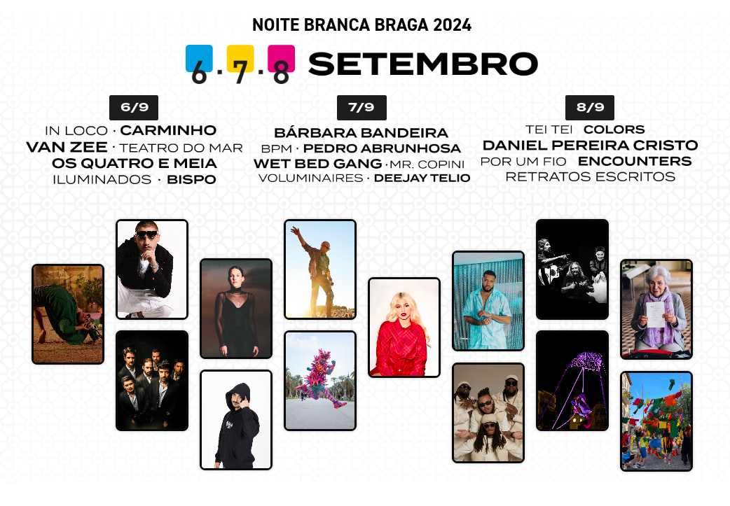 Noite Branca Braga 2024 - Braga Concertos: Sexta, 6 setembro Paira – 19h00 Palco Jazz Lucas de Freitas – 21h00 Palco Authentica Godua – 21h30 Palco Jazz Carminho – 22h00 Palco Pópulo Van Zee – 23h00 Palco Avenida Quim das Remisturas – 23h30 Palco Authentica Os Quatro e Meia – 23h45 Palco Pópulo Bispo – 00h45 Palco Avenida André Salvador – 01h00 Palco Authentica Dj Nelson Cunha – 02h15 Palco Avenida Sábado, 7 setembro Fenda Academy – Escrita Criativa – 18h00 Palco Jazz Joana Raquel – Queda Áscua – 19h00 Palco Jazz Farofa – 21h00 Palco Authentica Luís Ribeiro – A Invenção da Ficção – 21h30 Palco Jazz Bárbara Bandeira – 22h00 Palco Pópulo Afrobrothers – 23h00 Palco Authentica Wet Bed Gang – 23h00 Palco Avenida Pedro Abrunhosa – 23h45 Palco Pópulo Deejay Telio – 00h45 Palco Avenida André Salvador – 01h00 Palco Authentica Conguito – 02h15 Palco Avenida Domingo, 8 setembro Daniel Pereira Cristo – Tradição em Novo Palco – 16h30 Palco Avenida Performances Sexta, 6 setembro Companhia Absurda – In Loco – 16h00 Palco Rossio Ale Hop – 18h00 Ruas do Centro Histórico Bucraá Circus – El Gran Final – 18h00 Praça Mestre Veiga Stalker Teatro – Steli – 19h00 Rua Francisco Sanches Cie Poc – Bobby Et Moi – 19h30 Palco Rossio Teatro do Mar – NUMB – 21h30 Palco Praça Municipal Radar 360º – Iluminados – 21h30 Ruas do Centro Histórico Companhia Absurda – In Loco – 21h30 Palco Rossio Sábado, 7 setembro Cie Poc – BPM – 11h00 Palco Rossio André Pereira – Retratos Escritos – 11h00/13/00 Jardim de Sta. Bárbara Emiliano Alessi – Tei Tei – 11h00 Praça Mestre Veiga Projeto EZ – MARIOneto – 11h30 Ruas do Centro Histórico Stalker Teatro – Encounters – 15h00 Avenida da Liberdade Walo World: Color invasion – Mr. Copini – 15h30 Ruas do Centro Histórico Rauxa Cía – A Crise da Imaginação – 16h00 Palco Rossio Ale Hop – Voluminaires – 16h30 Ruas do Centro Histórico Projeto Ez – MARIOneto – 16h30 Ruas do Centro Histórico Companhia Nuvem Voadora – Bufanfa – 17h00 Ruas do Centro Histórico Emiliano Alessi – Tei Tei – 17h30 Ruas do Centro Histórico Walo World: Color invasion – Mr. Copini – 18h00 Ruas do Centro Histórico Ale Hop – Voluminaires – 18h30 Ruas do Centro Histórico Cie Poc – BPM – 18h30 Palco Rossio André Pereira – Retratos Escritos – 19h00 Jardim de Sta. Bárbara Bombar’t – 20h00 Ruas do Centro Histórico Ale Hop – Voluminaires – 21h00 Ruas do Centro Histórico Walo World: Color invasion – Mr. Copini – 21h30 Palco Rossio Teatro do Mar – NUMB – 21h30 Palco Praça Municipal Domingo, 8 setembro Rauxa Cía – A Crise da Imaginação – 11h00 Palco Rossio André Pereira – Retratos Escritos – 11h00 – 13h00 Jardim de Sta. Bárbara Emiliano Alessi – Tei Tei – 11h00 Ruas do Centro Histórico Stalker Teatro – 11h30 Avenida Central Ale Hop – Colors – 12h00 / 14h00 Ruas do Centro Histórico André Pereira – Retratos Escritos – 15h00 – 17h00 Jardim de Sta. Bárbara Erva Daninha e Daniel Seabra – Por um Fio – 15h30 Palco Rossio Walo World: Color invasion – Mr. Copini – 15h30 Ruas do Centro Histórico Emiliano Alessi – Tei Tei – 16h00 Praça Mestre Veiga Walo World: Color invasion – Mr. Copini – 17h00 Ruas do Centro Histórico