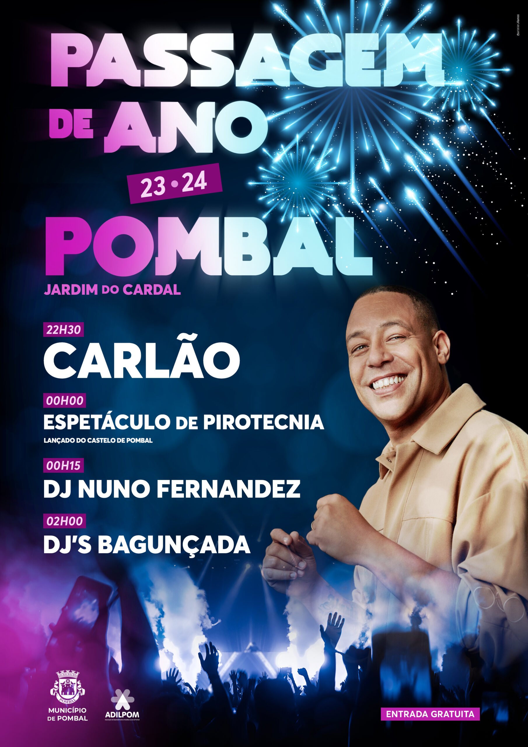 Ecrã completoEvento terminadoPassagem de Ano 2023 - Pombal📅Datadomingo, 31 de dezembro de 2023📍LocalJardim do Cardal, Pombal, Pombal (Leiria)🌐Websitehttps://cultura.cm-pombal.pt/event/passagem-de-ano/🗺️DireçõesWaze|Google MapsSobre este eventoPassagem de Ano 2023 - PombalLocalização